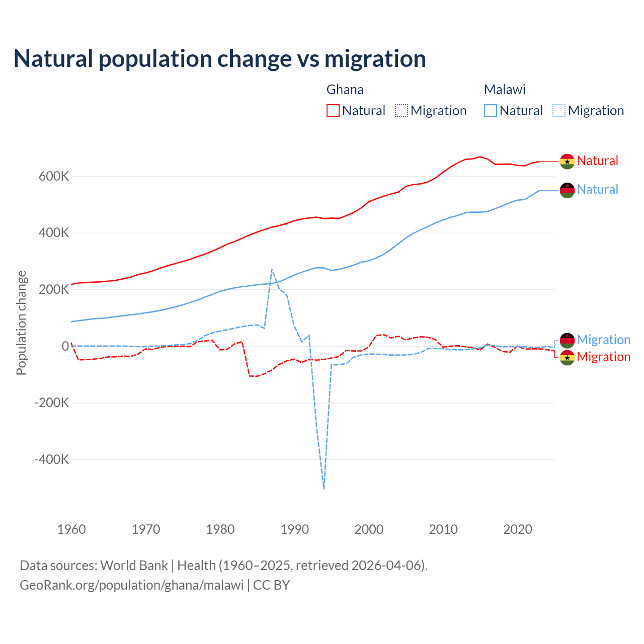 Over the last 10 years, 98.6% of the population change in Ghana is from natural causes (a gain of 6,484,449 people) and 1.37% is from migration (a loss of 90,310 people). In Malawi 99.3% is from natural causes (a gain of 5,019,393 people) and 0.67% is from migration (a loss of 33,768 people).