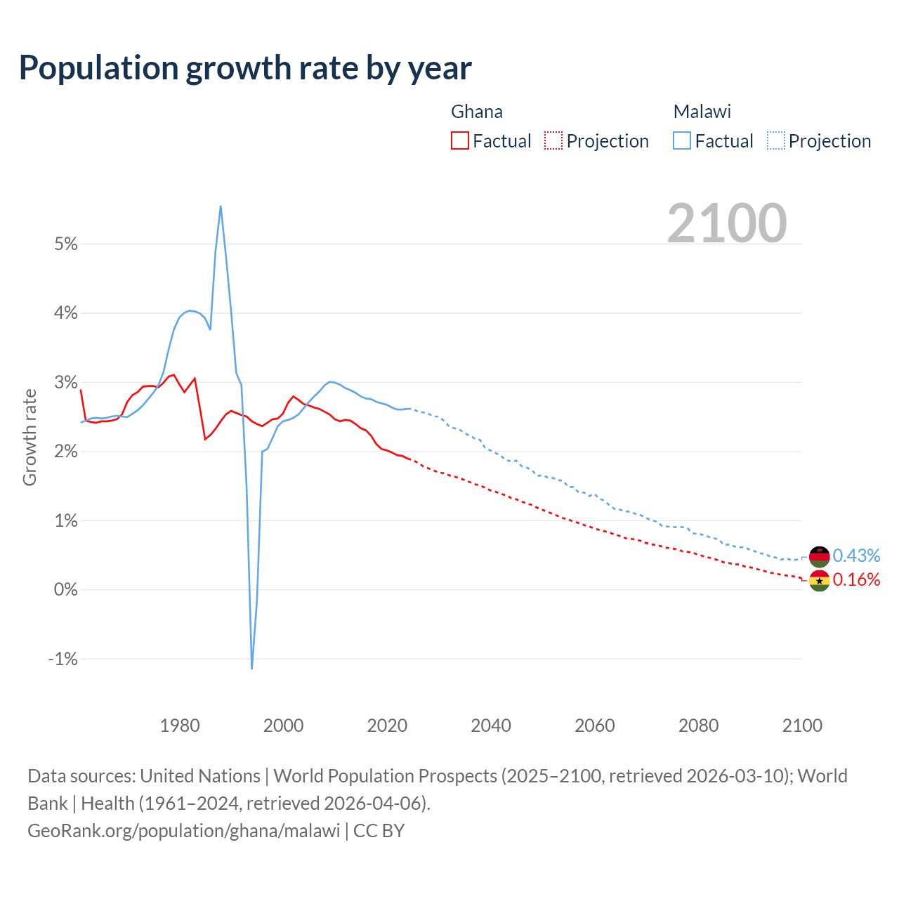 - For the last 10 years, Ghana has had an average growth rate of +2.1% per year vs +2.7% in Malawi.