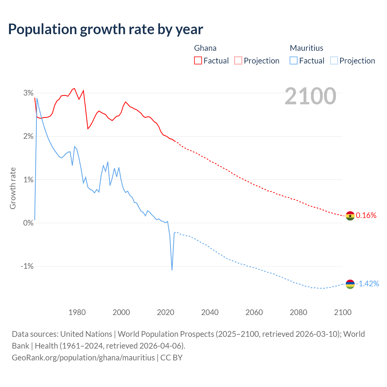 - For the last 10 years, Ghana has had an average growth rate of +2.1% per year vs -0.09% in Mauritius.