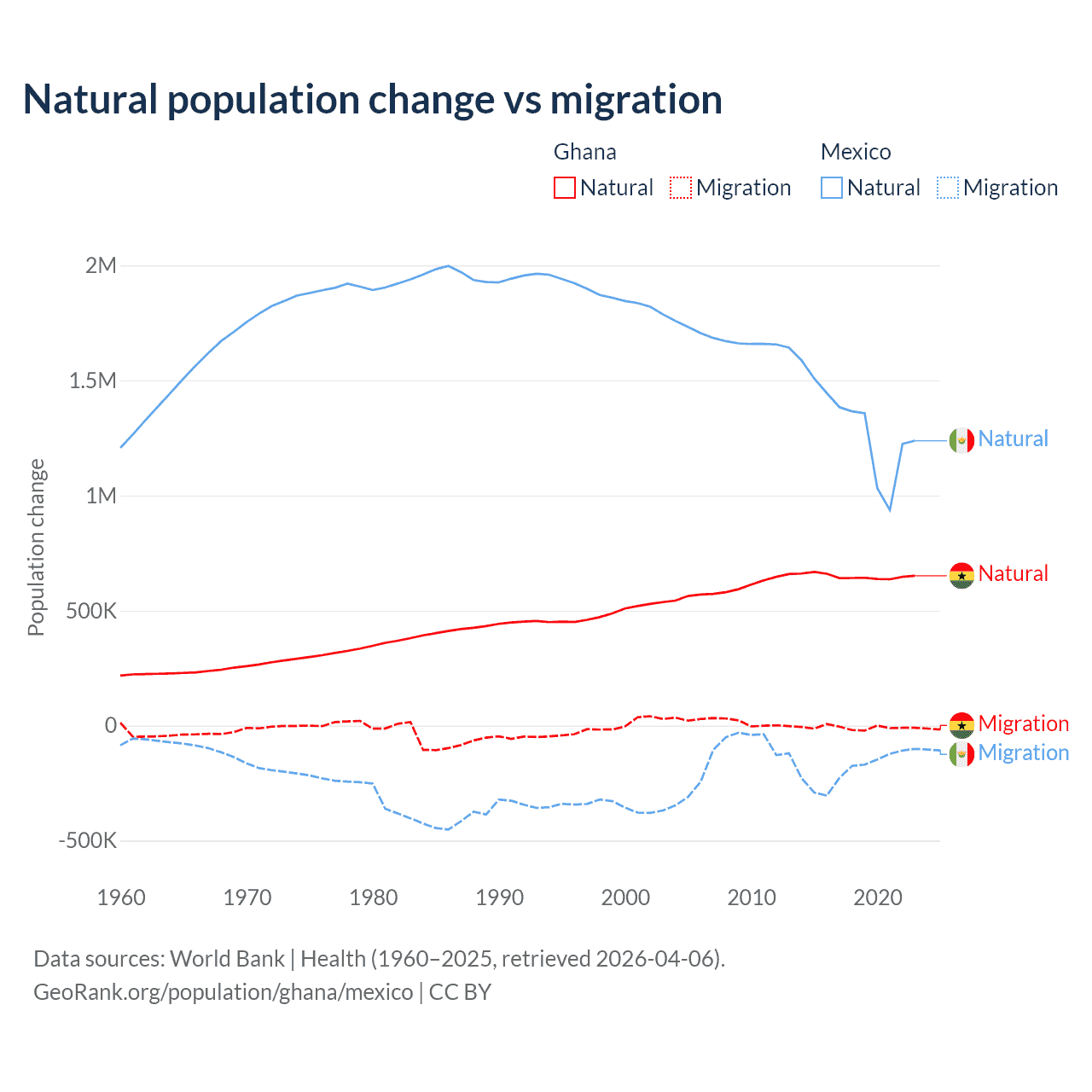 Over the last 10 years, 98.6% of the population change in Ghana is from natural causes (a gain of 6,484,449 people) and 1.37% is from migration (a loss of 90,310 people). In Mexico 87.5% is from natural causes (a gain of 13,080,136 people) and 12.5% is from migration (a loss of 1,876,544 people).