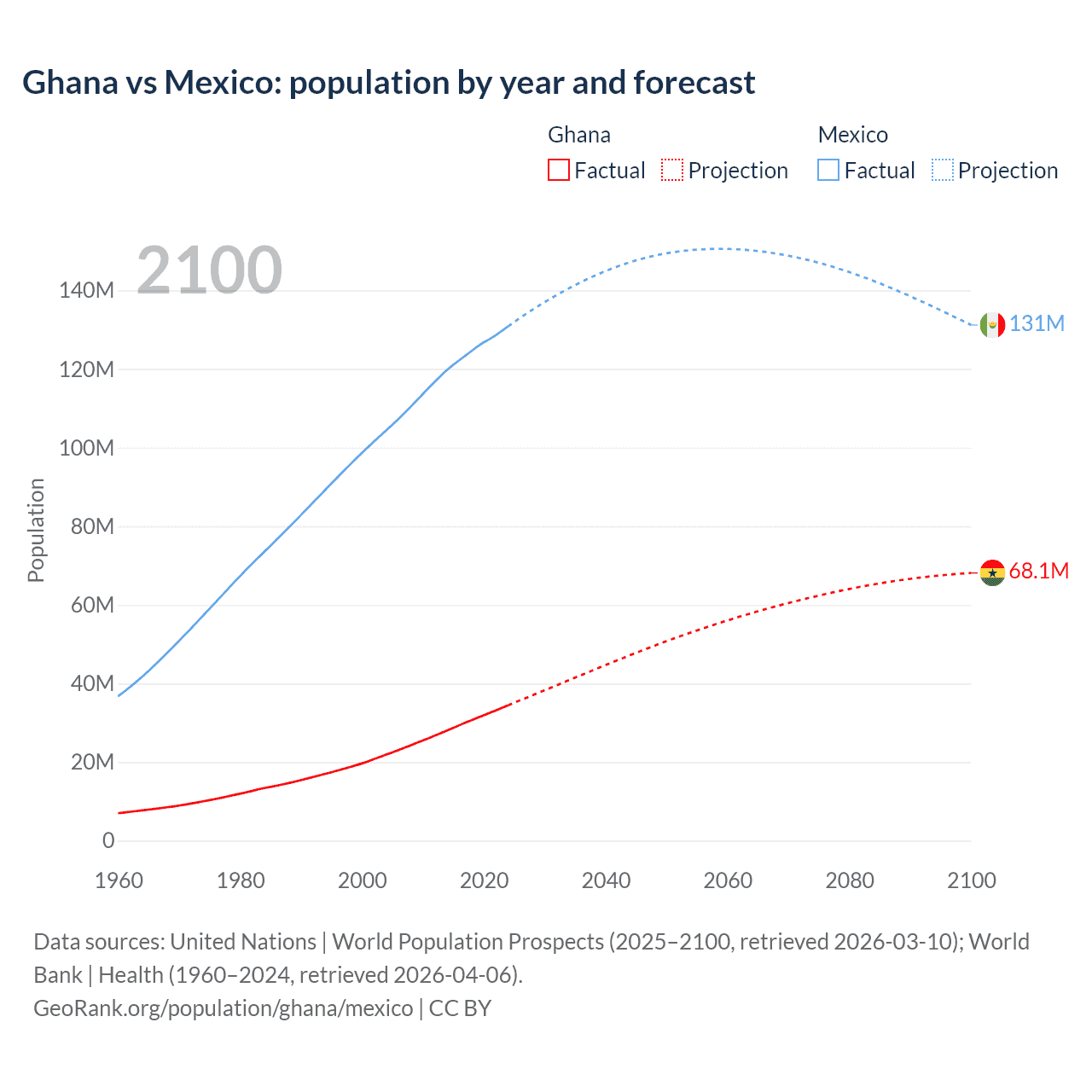 The latest officially reported population of Ghana was 34,427,414 in 2024 vs 130,861,007 people in Mexico in 2024. In 2026, based on the adjusted UN estimation, the current Ghana's population is 35,885,254 people compared to 133,323,134 in Mexico.