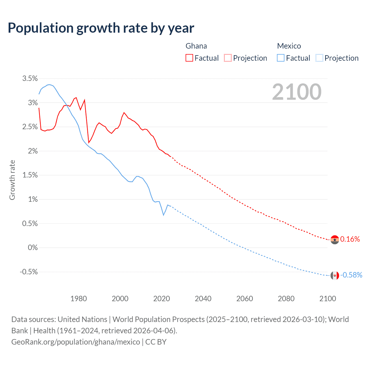 - For the last 10 years, Ghana has had an average growth rate of +2.1% per year vs +0.92% in Mexico.