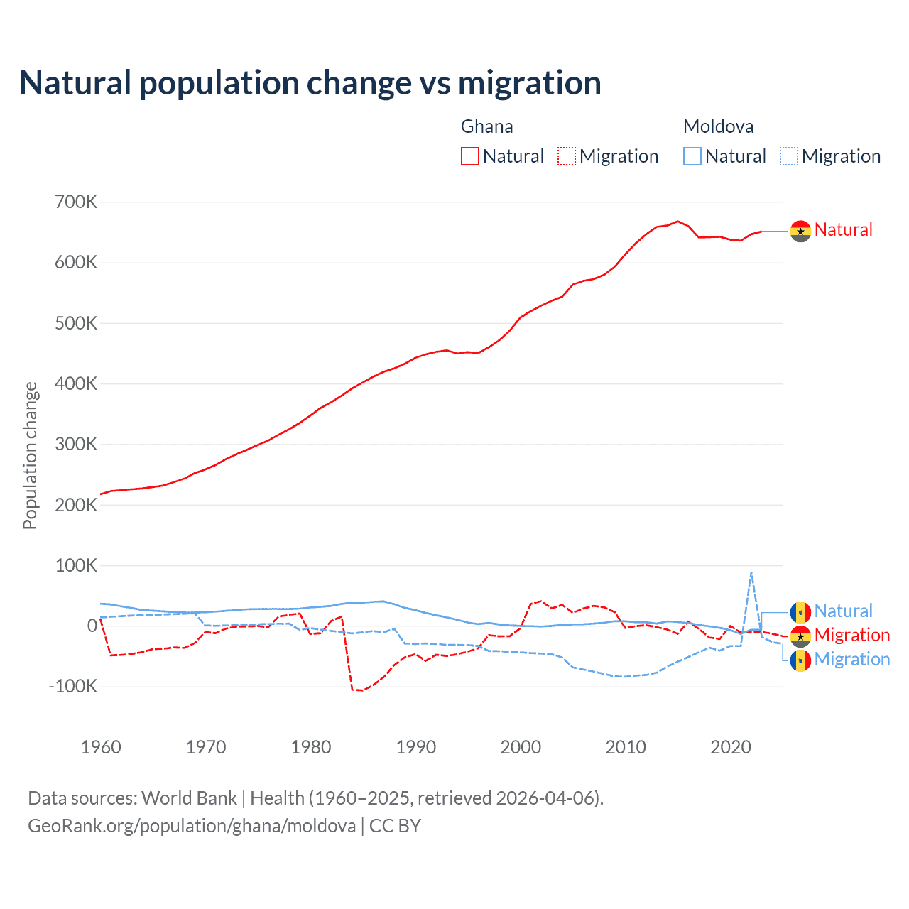 Over the last 10 years, 98.6% of the population change in Ghana is from natural causes (a gain of 6,484,449 people) and 1.37% is from migration (a loss of 90,310 people). In Moldova 6.04% is from natural causes (a loss of 19,001 people) and 94% is from migration (a loss of 295,631 people).