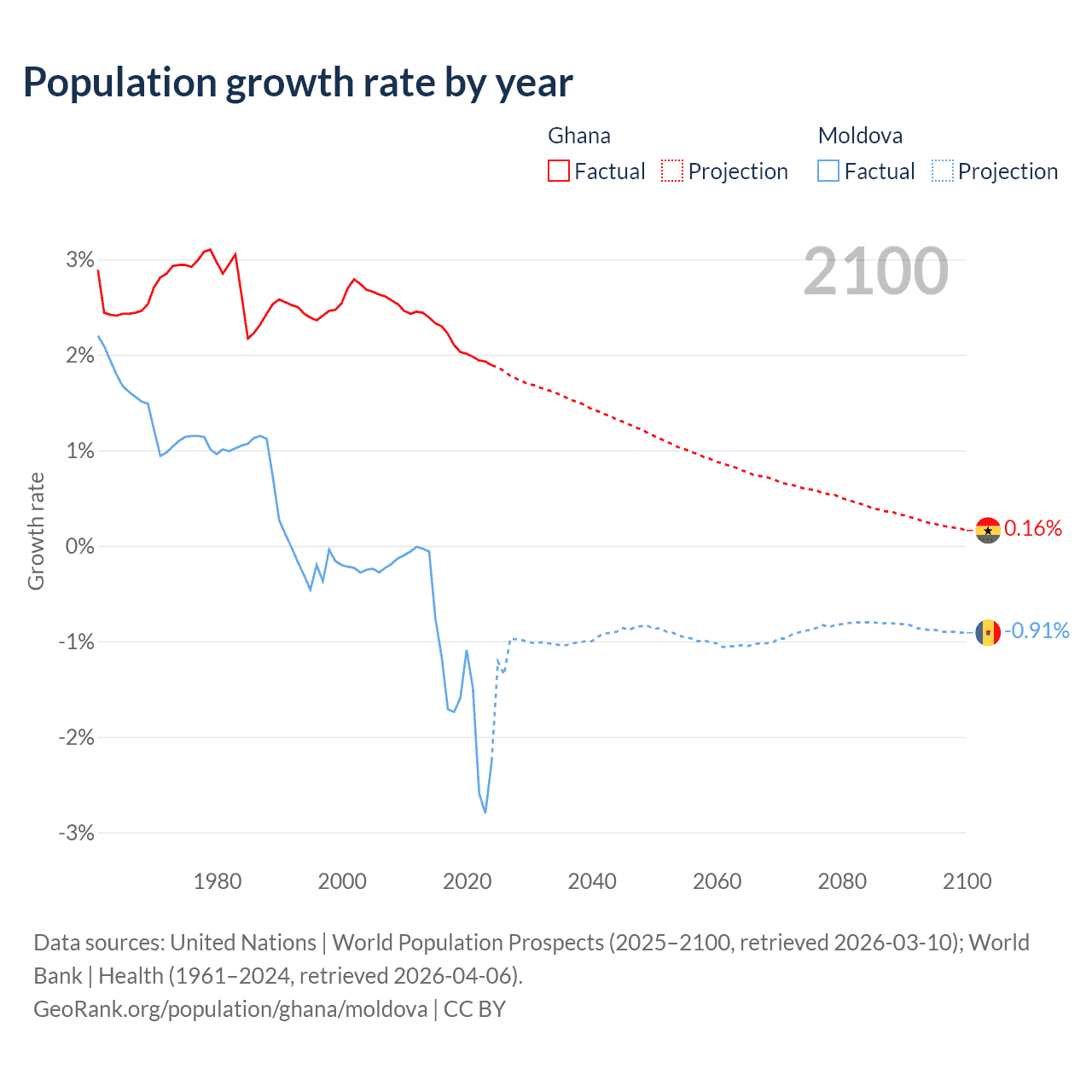 - For the last 10 years, Ghana has had an average growth rate of +2.1% per year vs -1.57% in Moldova.