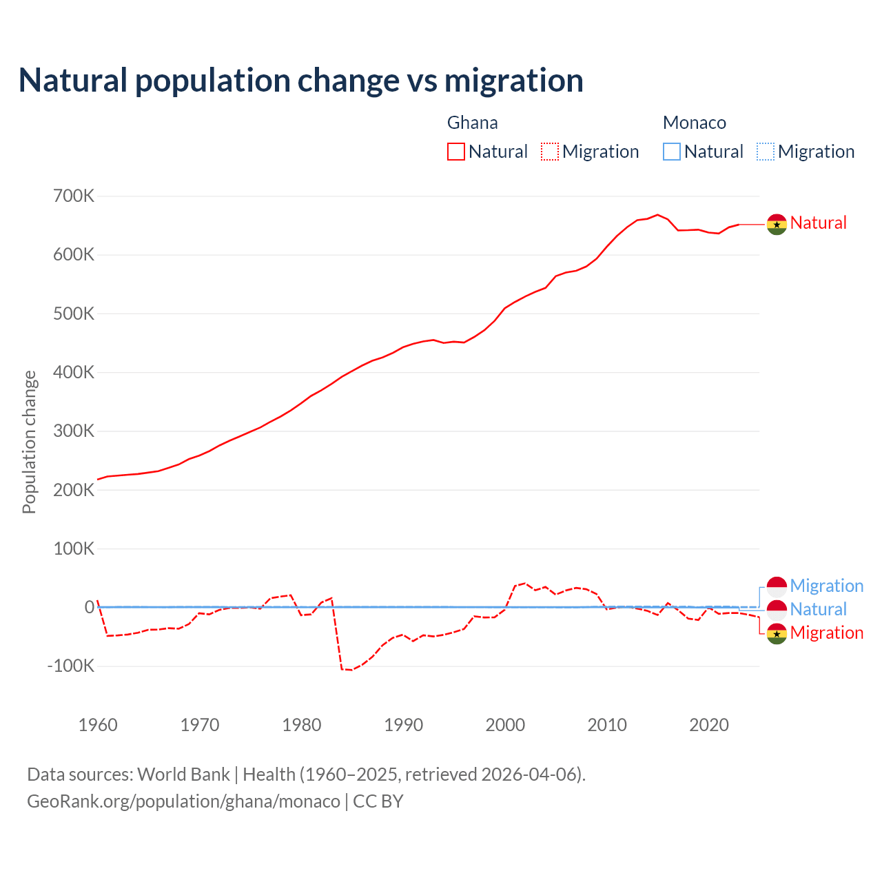 Over the last 10 years, 98.6% of the population change in Ghana is from natural causes (a gain of 6,484,449 people) and 1.37% is from migration (a loss of 90,310 people). In Monaco 37.3% is from natural causes (a loss of 4,357 people) and 62.7% is from migration (a gain of 7,333 people).