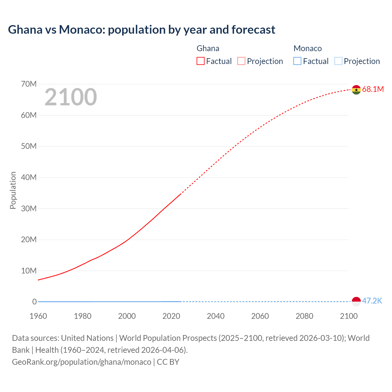 The latest officially reported population of Ghana was 34,427,414 in 2024 vs 38,631 people in Monaco in 2024. In 2026, based on the adjusted UN estimation, the current Ghana's population is 35,885,254 people compared to 38,053 in Monaco.