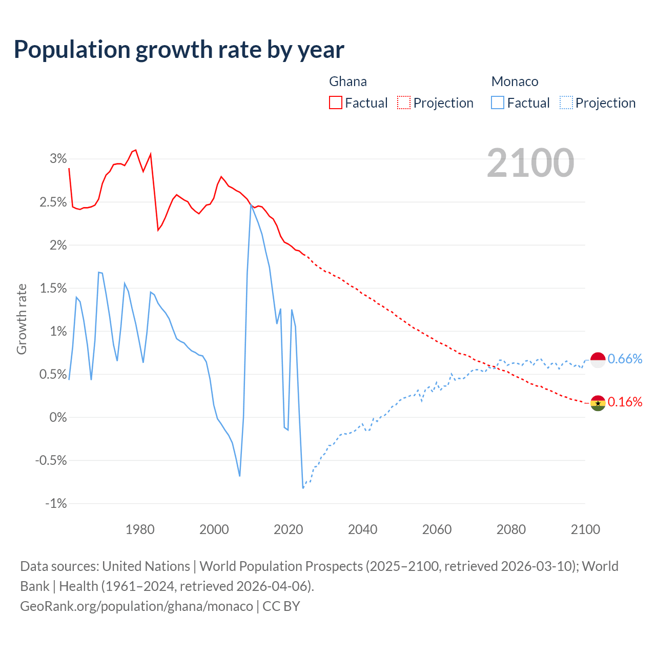 - For the last 10 years, Ghana has had an average growth rate of +2.1% per year vs +0.79% in Monaco.