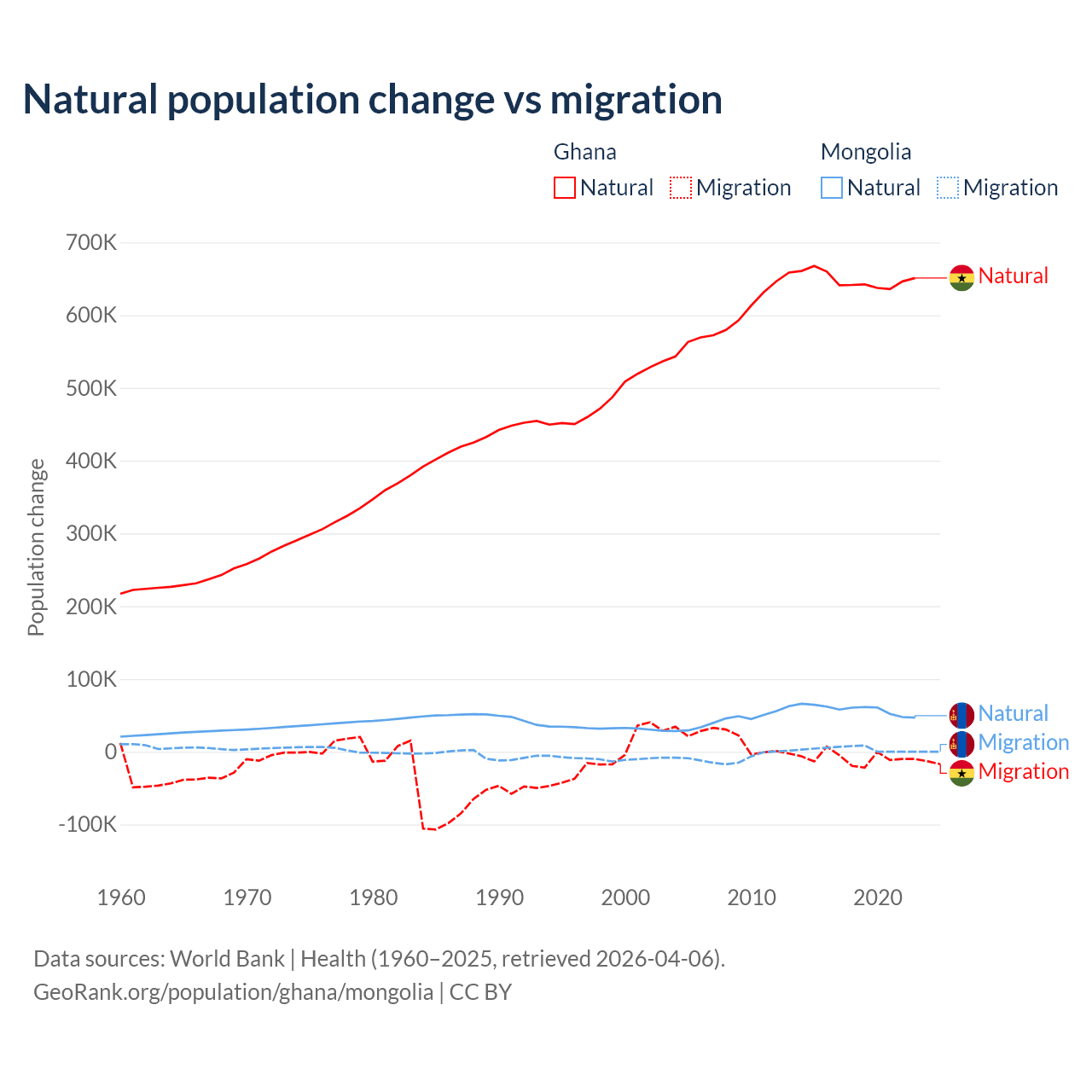 Over the last 10 years, 98.6% of the population change in Ghana is from natural causes (a gain of 6,484,449 people) and 1.37% is from migration (a loss of 90,310 people). In Mongolia 94.1% is from natural causes (a gain of 580,367 people) and 5.87% is from migration (a gain of 36,163 people).