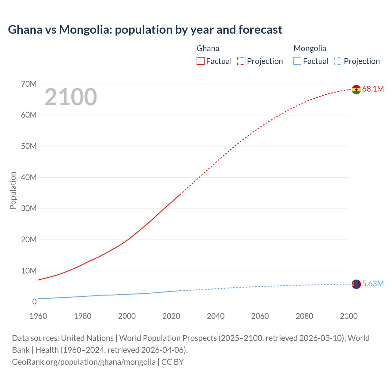 The latest officially reported population of Ghana was 34,427,414 in 2024 vs 3,524,788 people in Mongolia in 2024. In 2026, based on the adjusted UN estimation, the current Ghana's population is 35,885,254 people compared to 3,620,317 in Mongolia.