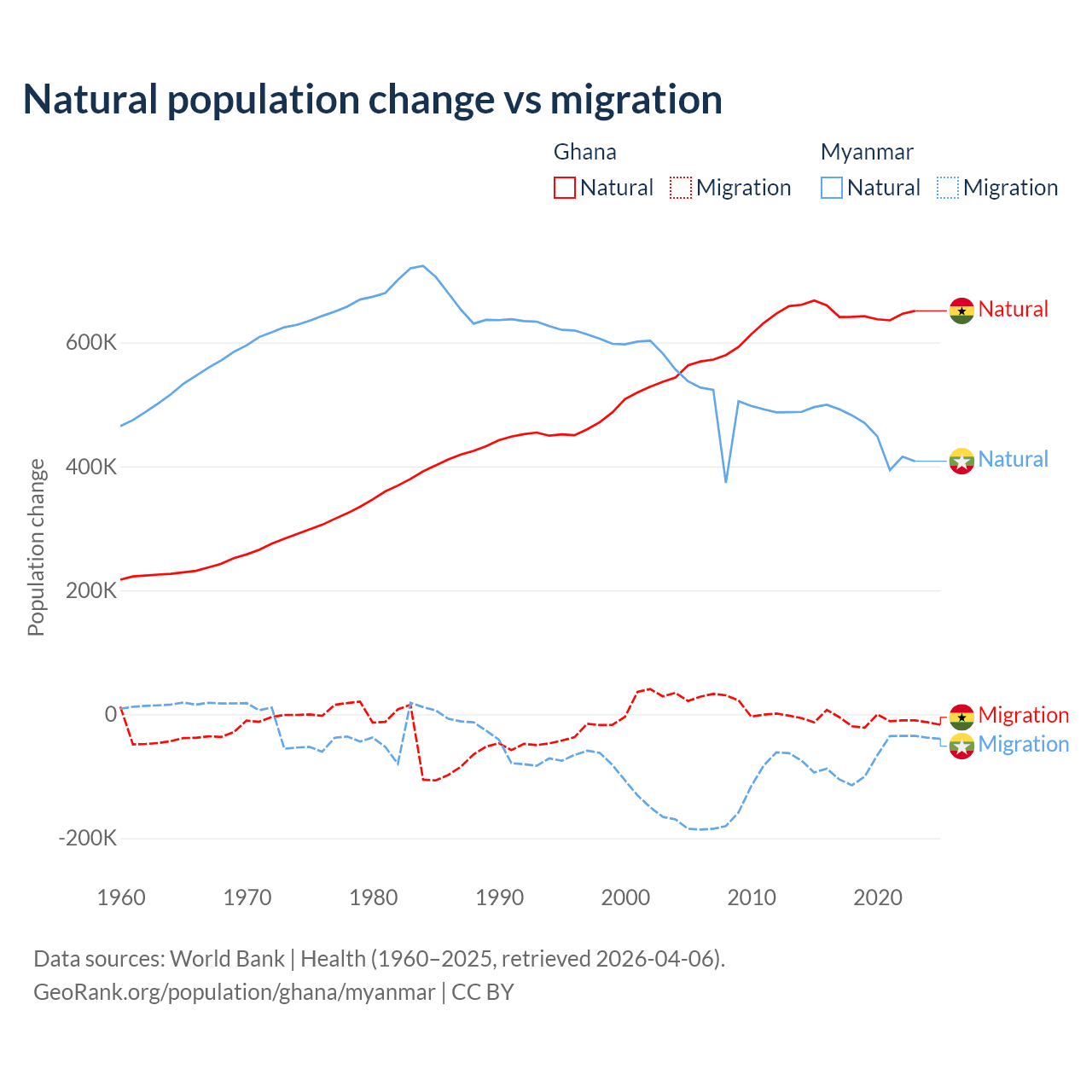 Over the last 10 years, 98.6% of the population change in Ghana is from natural causes (a gain of 6,484,449 people) and 1.37% is from migration (a loss of 90,310 people). In Myanmar 86% is from natural causes (a gain of 4,594,615 people) and 14% is from migration (a loss of 749,272 people).