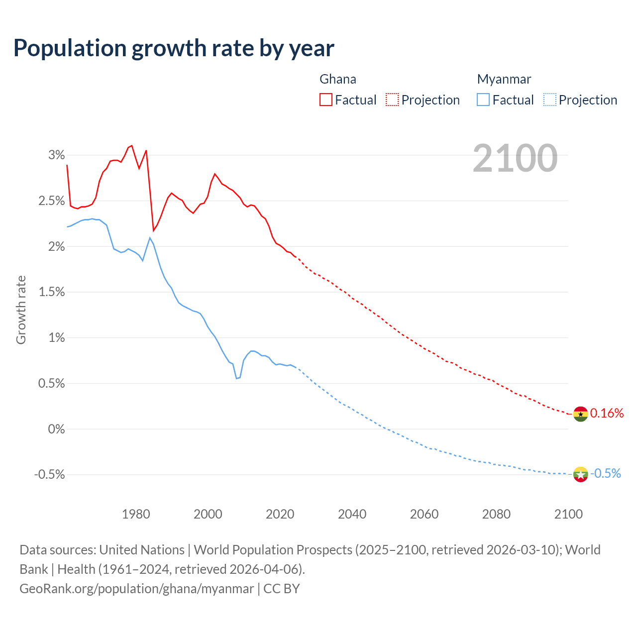 - For the last 10 years, Ghana has had an average growth rate of +2.1% per year vs +0.74% in Myanmar.