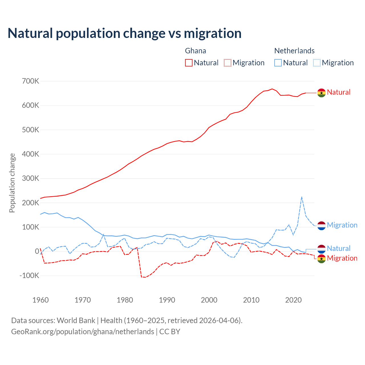 Over the last 10 years, 98.6% of the population change in Ghana is from natural causes (a gain of 6,484,449 people) and 1.37% is from migration (a loss of 90,310 people). In the Netherlands 11.8% is from natural causes (a gain of 134,554 people) and 88.2% is from migration (a gain of 1,006,495 people).