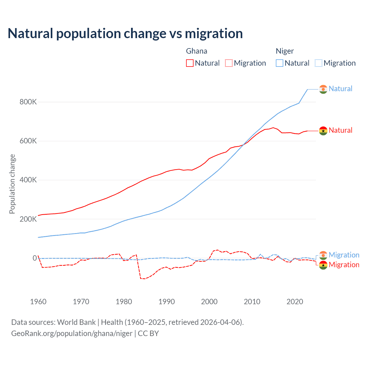 Over the last 10 years, 98.6% of the population change in Ghana is from natural causes (a gain of 6,484,449 people) and 1.37% is from migration (a loss of 90,310 people). In Niger 100% is from natural causes (a gain of 7,728,287 people) and 0.03% is from migration (a gain of 2,520 people).