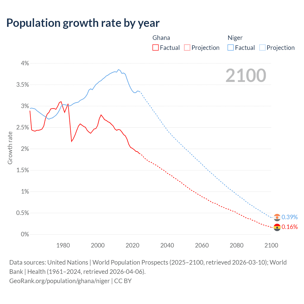 - For the last 10 years, Ghana has had an average growth rate of +2.1% per year vs +3.5% in Niger.
