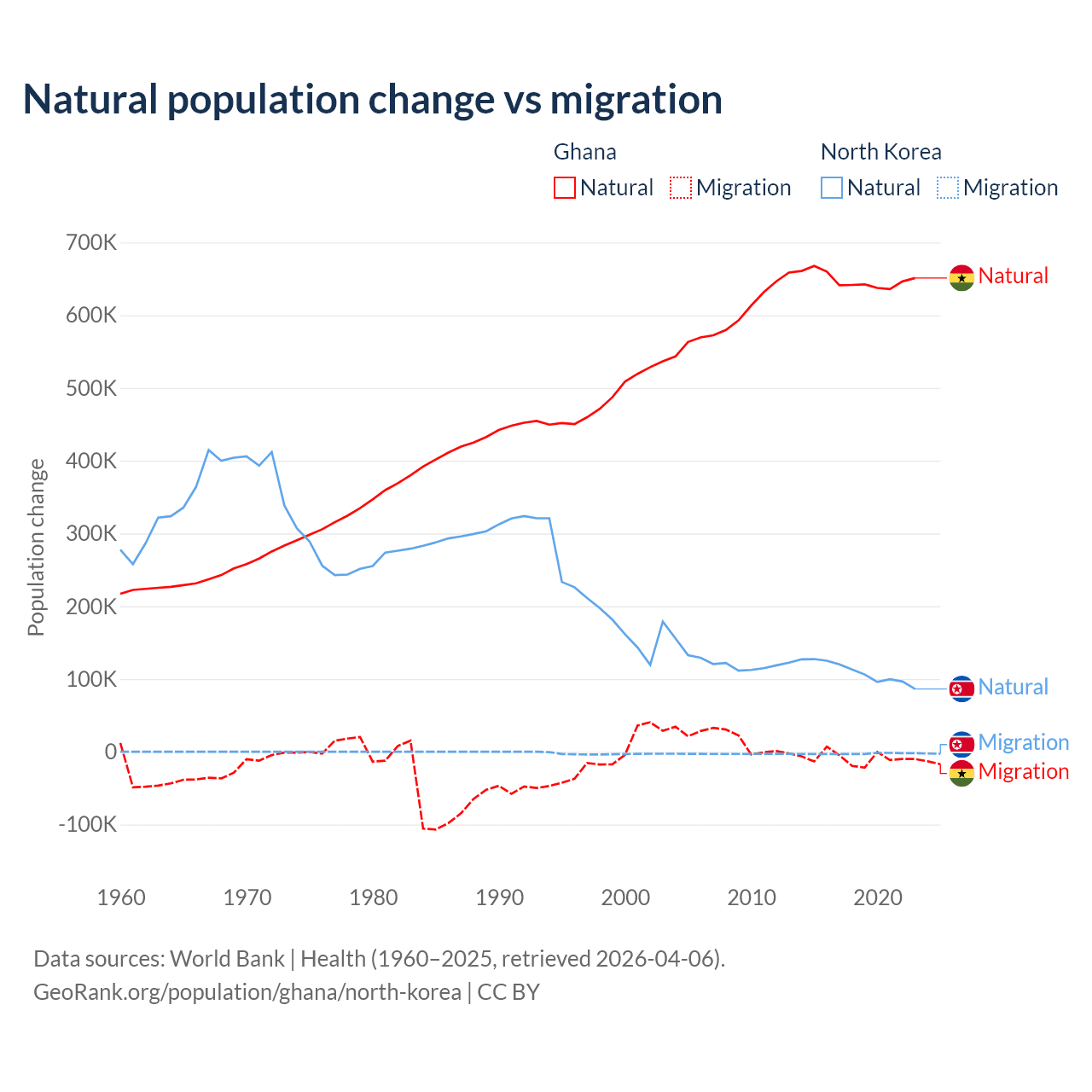 Over the last 10 years, 98.6% of the population change in Ghana is from natural causes (a gain of 6,484,449 people) and 1.37% is from migration (a loss of 90,310 people). In North Korea 97.7% is from natural causes (a gain of 1,097,372 people) and 2.33% is from migration (a loss of 26,227 people).