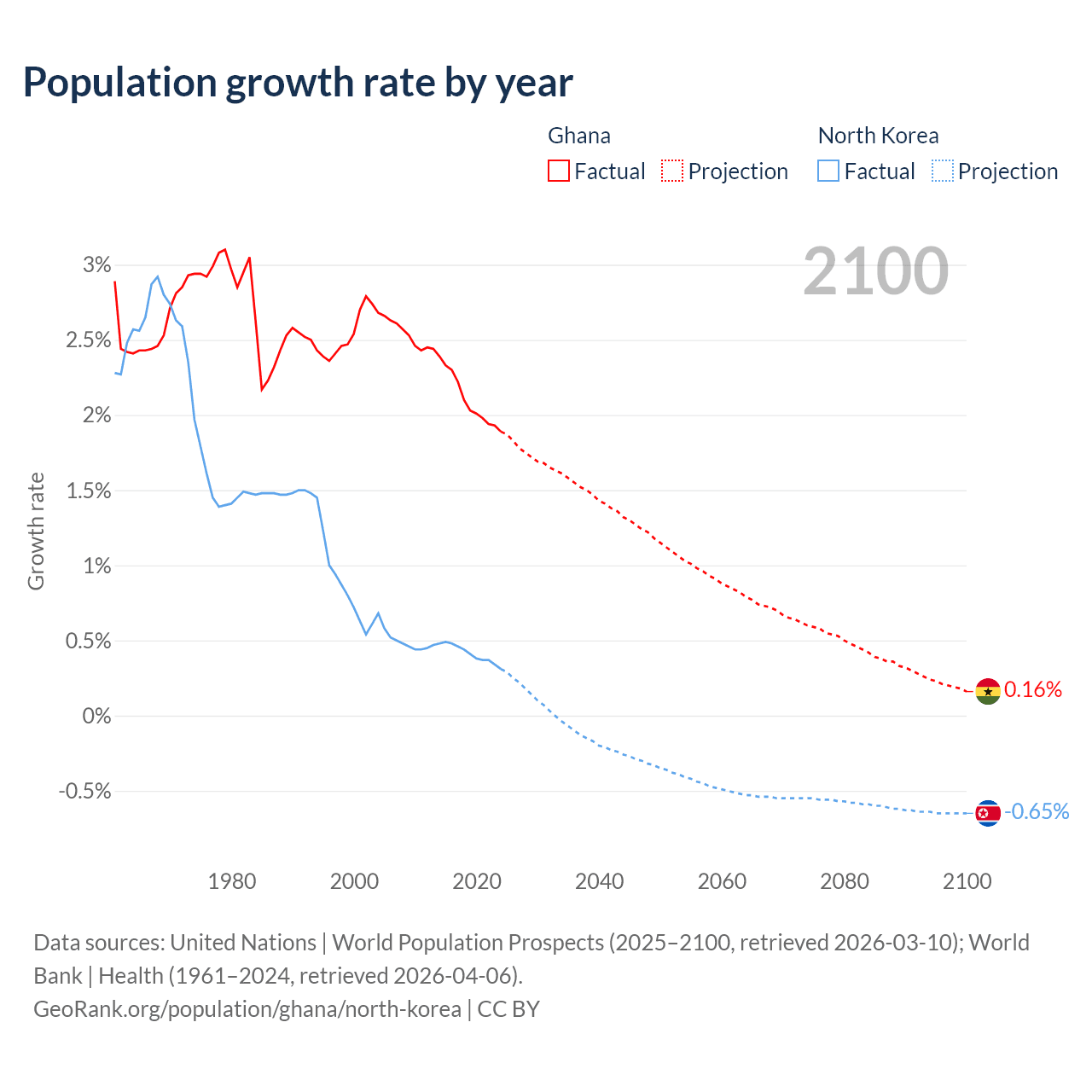 - For the last 10 years, Ghana has had an average growth rate of +2.1% per year vs +0.41% in North Korea.