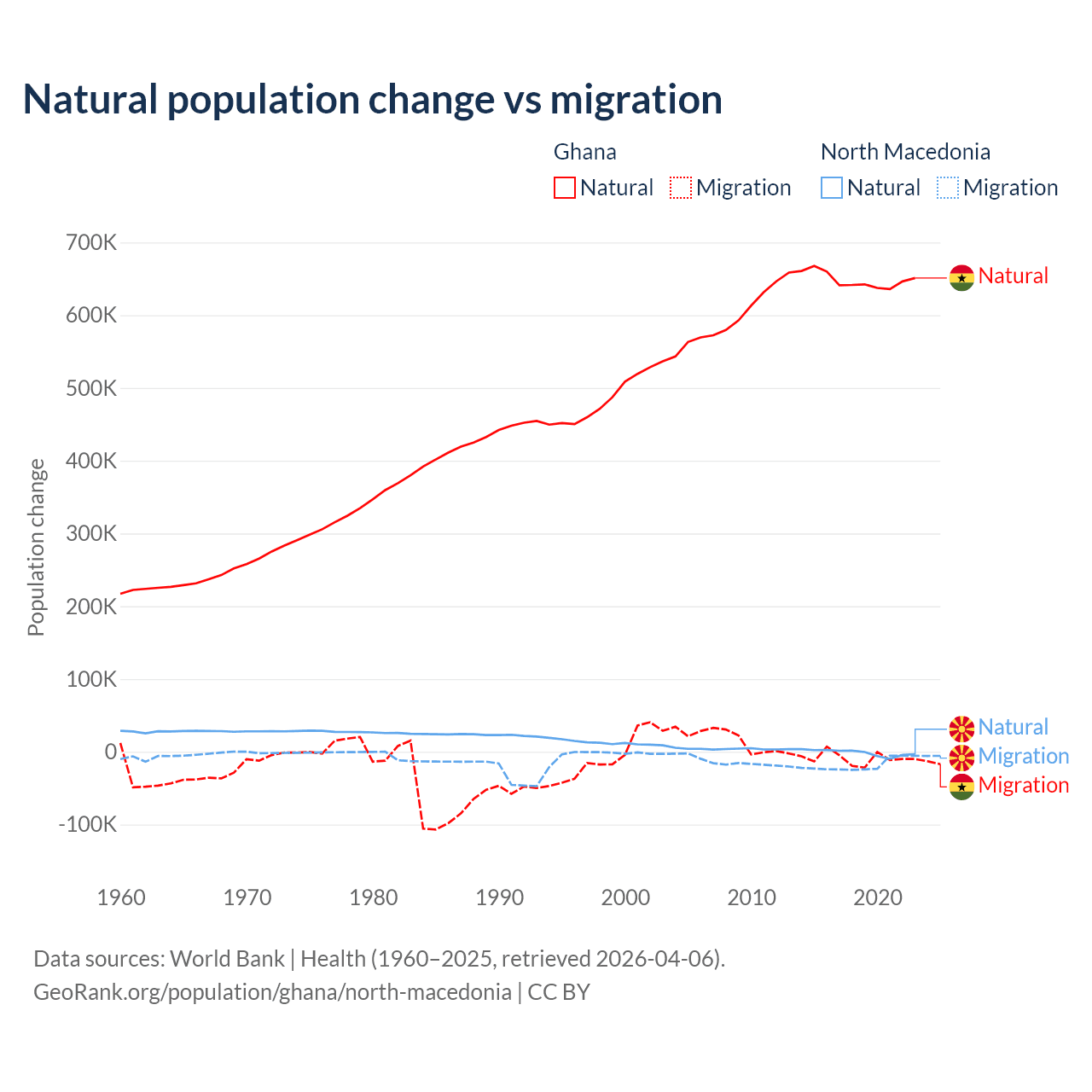 Over the last 10 years, 98.6% of the population change in Ghana is from natural causes (a gain of 6,484,449 people) and 1.37% is from migration (a loss of 90,310 people). In North Macedonia 6.45% is from natural causes (a loss of 12,585 people) and 93.5% is from migration (a loss of 182,429 people).