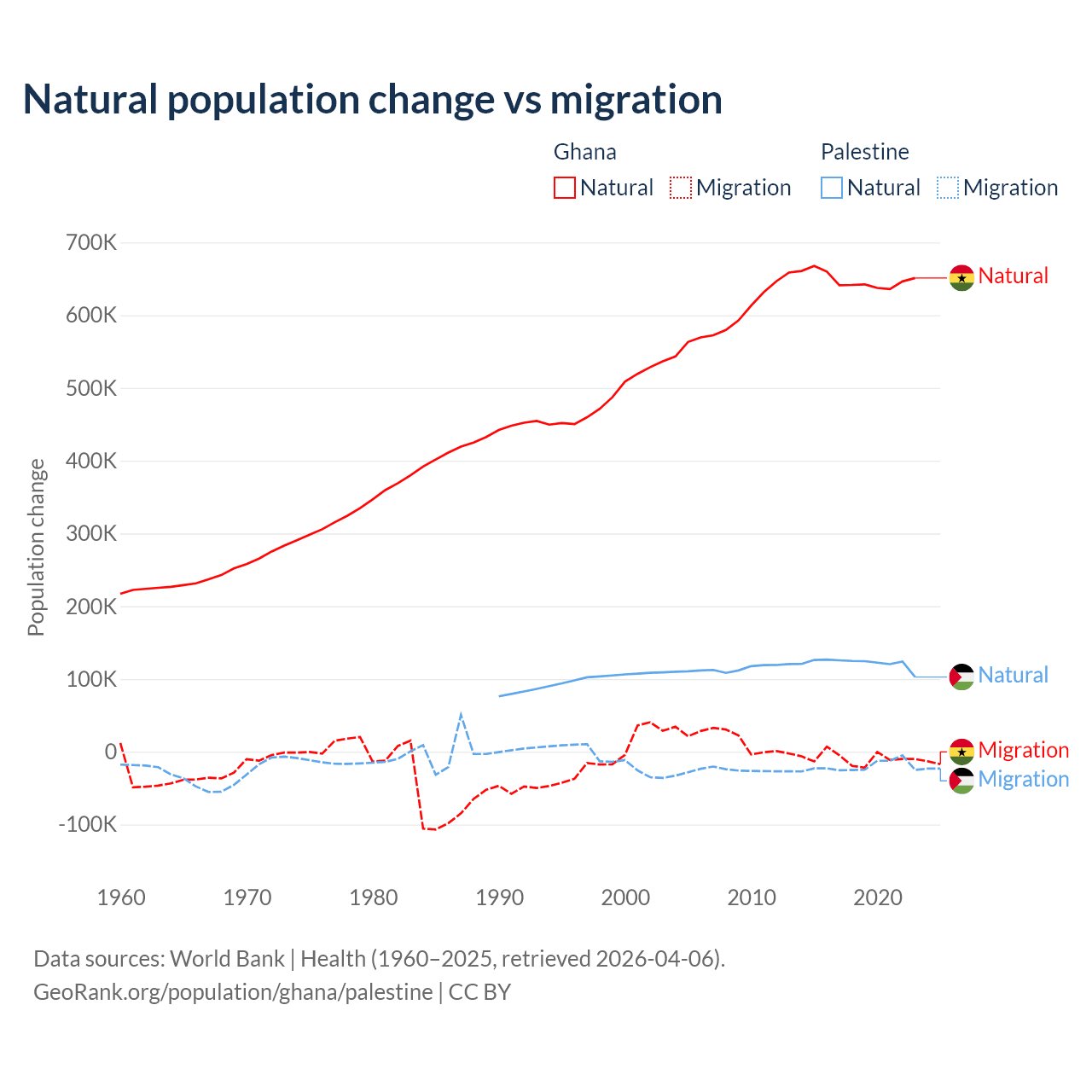 Over the last 10 years, 98.6% of the population change in Ghana is from natural causes (a gain of 6,484,449 people) and 1.37% is from migration (a loss of 90,310 people). In Palestine 85.7% is from natural causes (a gain of 1,218,010 people) and 14.3% is from migration (a loss of 202,820 people).