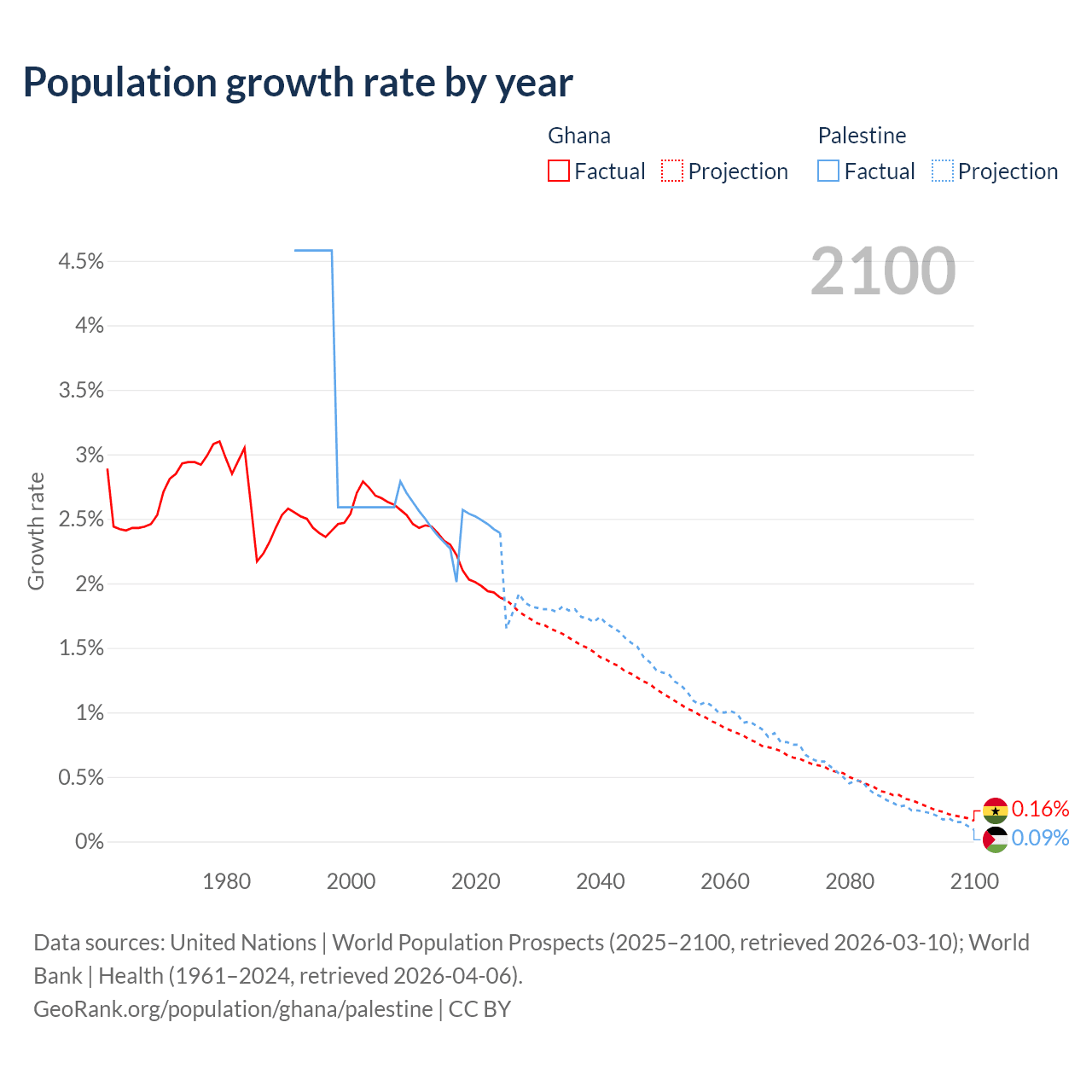 - For the last 10 years, Ghana has had an average growth rate of +2.1% per year vs +2.4% in Palestine.