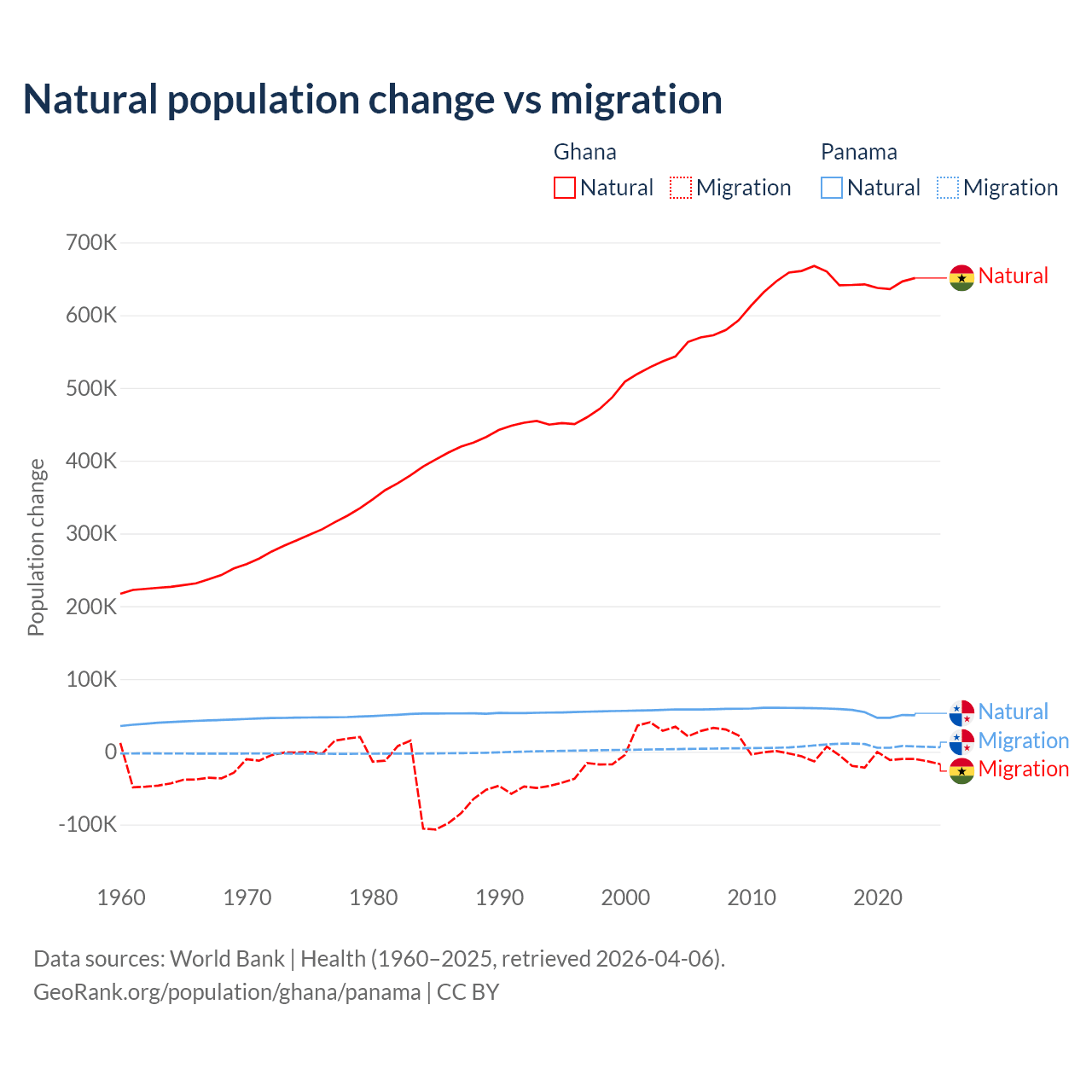 Over the last 10 years, 98.6% of the population change in Ghana is from natural causes (a gain of 6,484,449 people) and 1.37% is from migration (a loss of 90,310 people). In Panama 86.5% is from natural causes (a gain of 544,211 people) and 13.5% is from migration (a gain of 84,849 people).