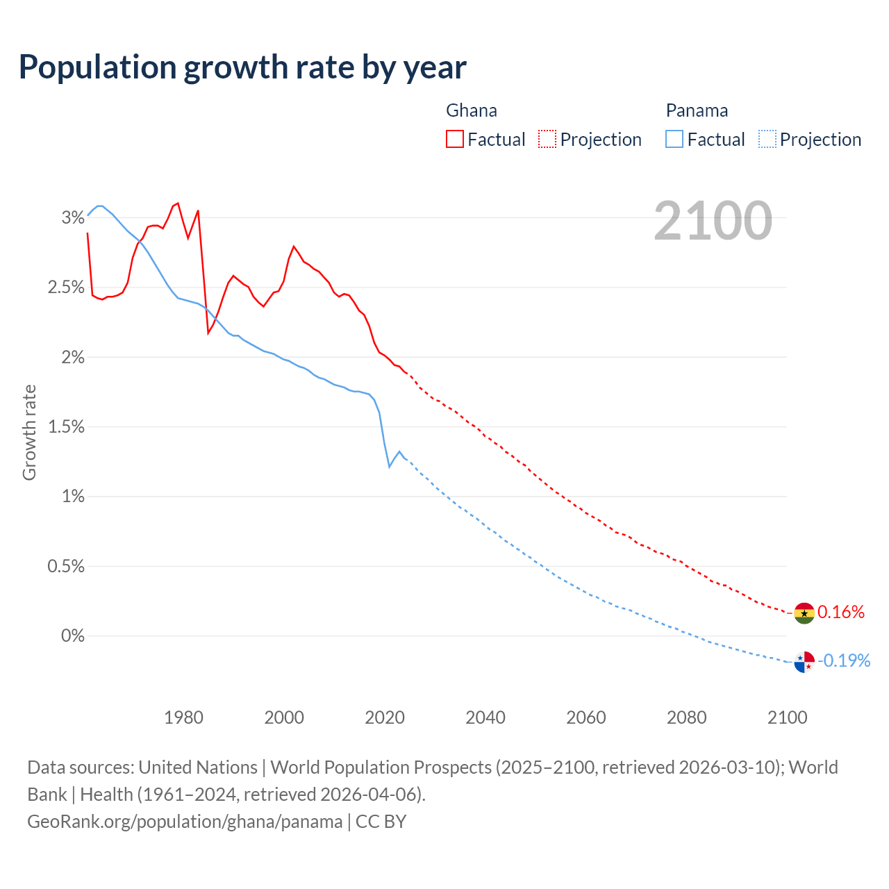 - For the last 10 years, Ghana has had an average growth rate of +2.1% per year vs +1.52% in Panama.