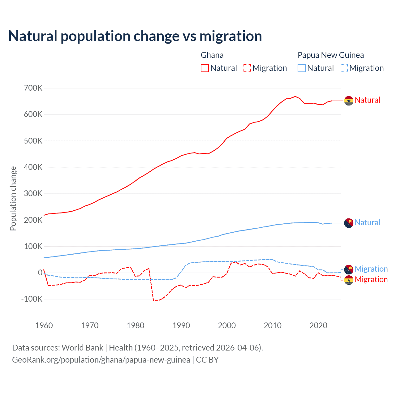Over the last 10 years, 98.6% of the population change in Ghana is from natural causes (a gain of 6,484,449 people) and 1.37% is from migration (a loss of 90,310 people). In Papua New Guinea 91% is from natural causes (a gain of 1,883,906 people) and 8.98% is from migration (a gain of 185,900 people).