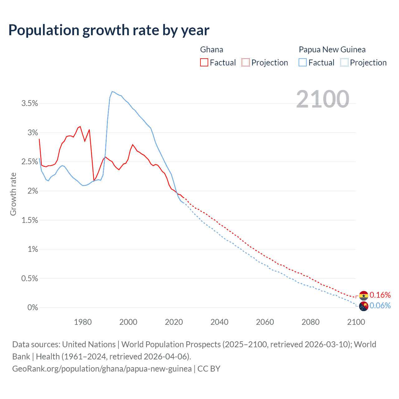 - For the last 10 years, Ghana has had an average growth rate of +2.1% per year vs +2.23% in Papua New Guinea.