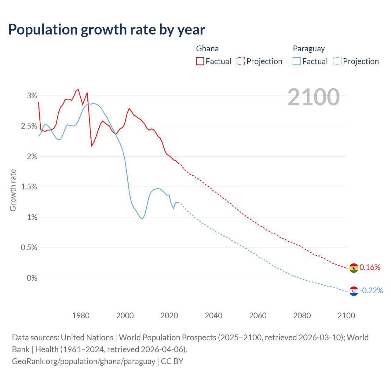 - For the last 10 years, Ghana has had an average growth rate of +2.1% per year vs +1.34% in Paraguay.