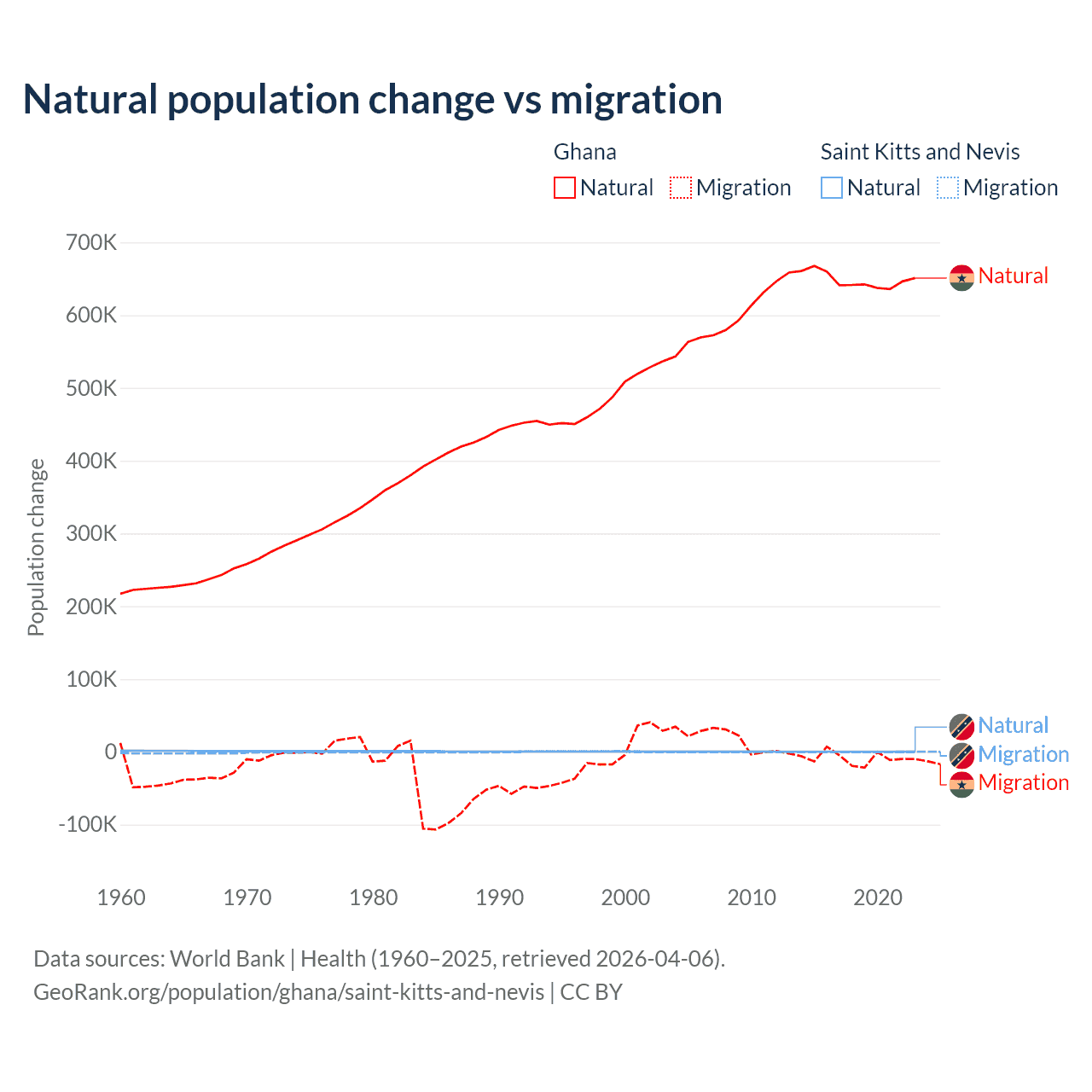 Over the last 10 years, 98.6% of the population change in Ghana is from natural causes (a gain of 6,484,449 people) and 1.37% is from migration (a loss of 90,310 people). In Saint Kitts and Nevis 44.9% is from natural causes (a gain of 1,225 people) and 55.1% is from migration (a loss of 1,506 people).