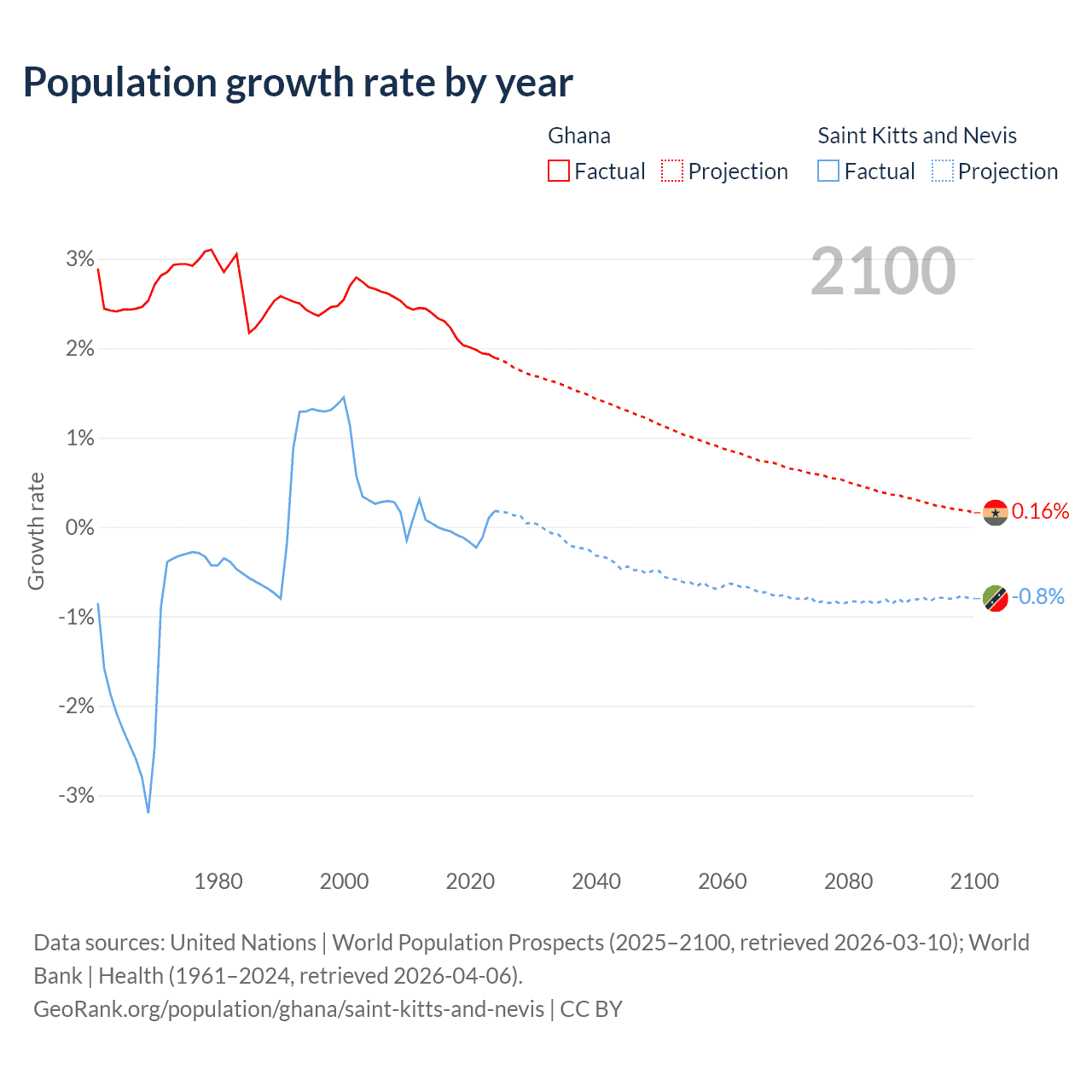 - For the last 10 years, Ghana has had an average growth rate of +2.1% per year vs -0.04% in Saint Kitts and Nevis.