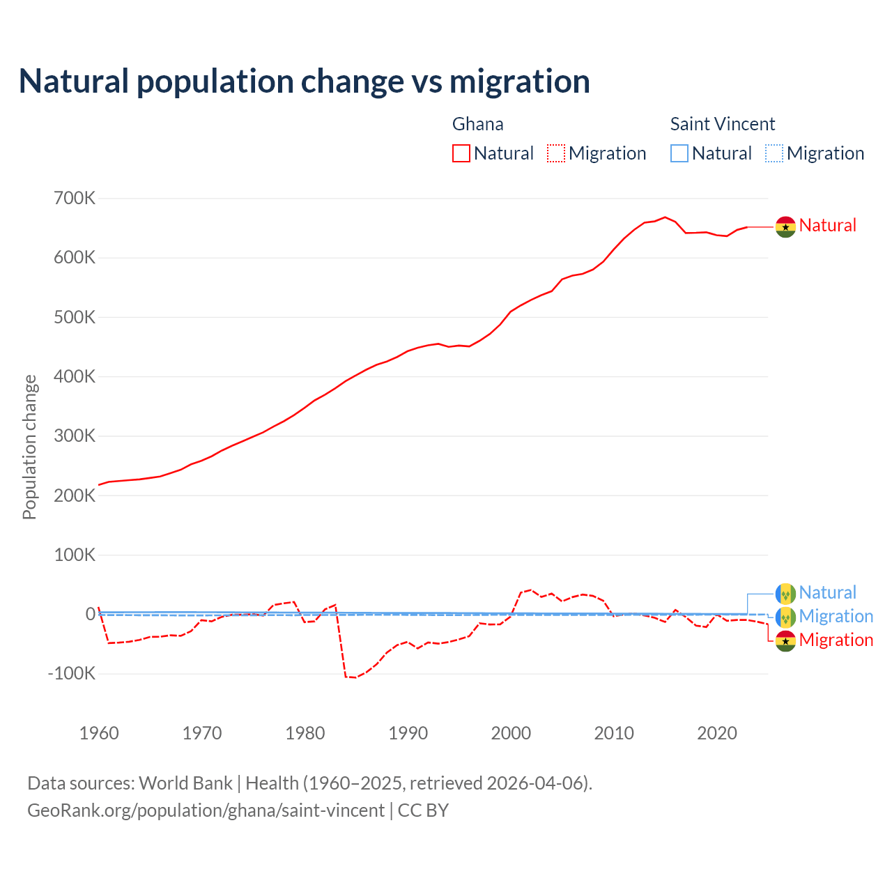 Over the last 10 years, 98.6% of the population change in Ghana is from natural causes (a gain of 6,484,449 people) and 1.37% is from migration (a loss of 90,310 people). In Saint Vincent 21.2% is from natural causes (a gain of 2,525 people) and 78.8% is from migration (a loss of 9,393 people).
