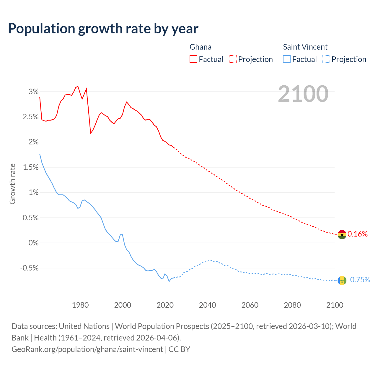 - For the last 10 years, Ghana has had an average growth rate of +2.1% per year vs -0.65% in Saint Vincent.