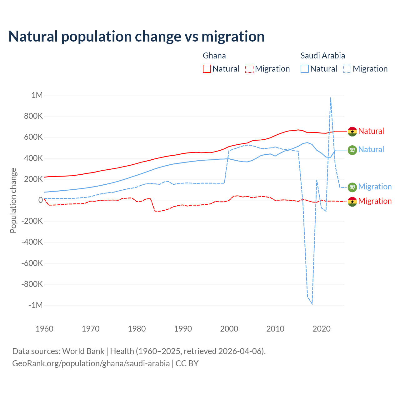 Over the last 10 years, 98.6% of the population change in Ghana is from natural causes (a gain of 6,484,449 people) and 1.37% is from migration (a loss of 90,310 people). In Saudi Arabia 93.9% is from natural causes (a gain of 4,829,562 people) and 6.05% is from migration (a gain of 311,209 people).