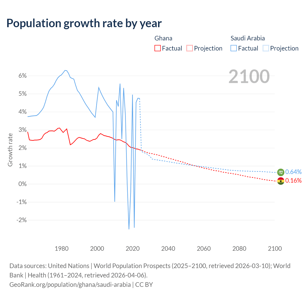 - For the last 10 years, Ghana has had an average growth rate of +2.1% per year vs +2.3% in Saudi Arabia.