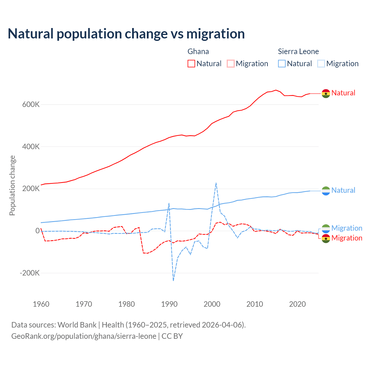 Over the last 10 years, 98.6% of the population change in Ghana is from natural causes (a gain of 6,484,449 people) and 1.37% is from migration (a loss of 90,310 people). In Sierra Leone 99.6% is from natural causes (a gain of 1,764,049 people) and 0.41% is from migration (a loss of 7,211 people).