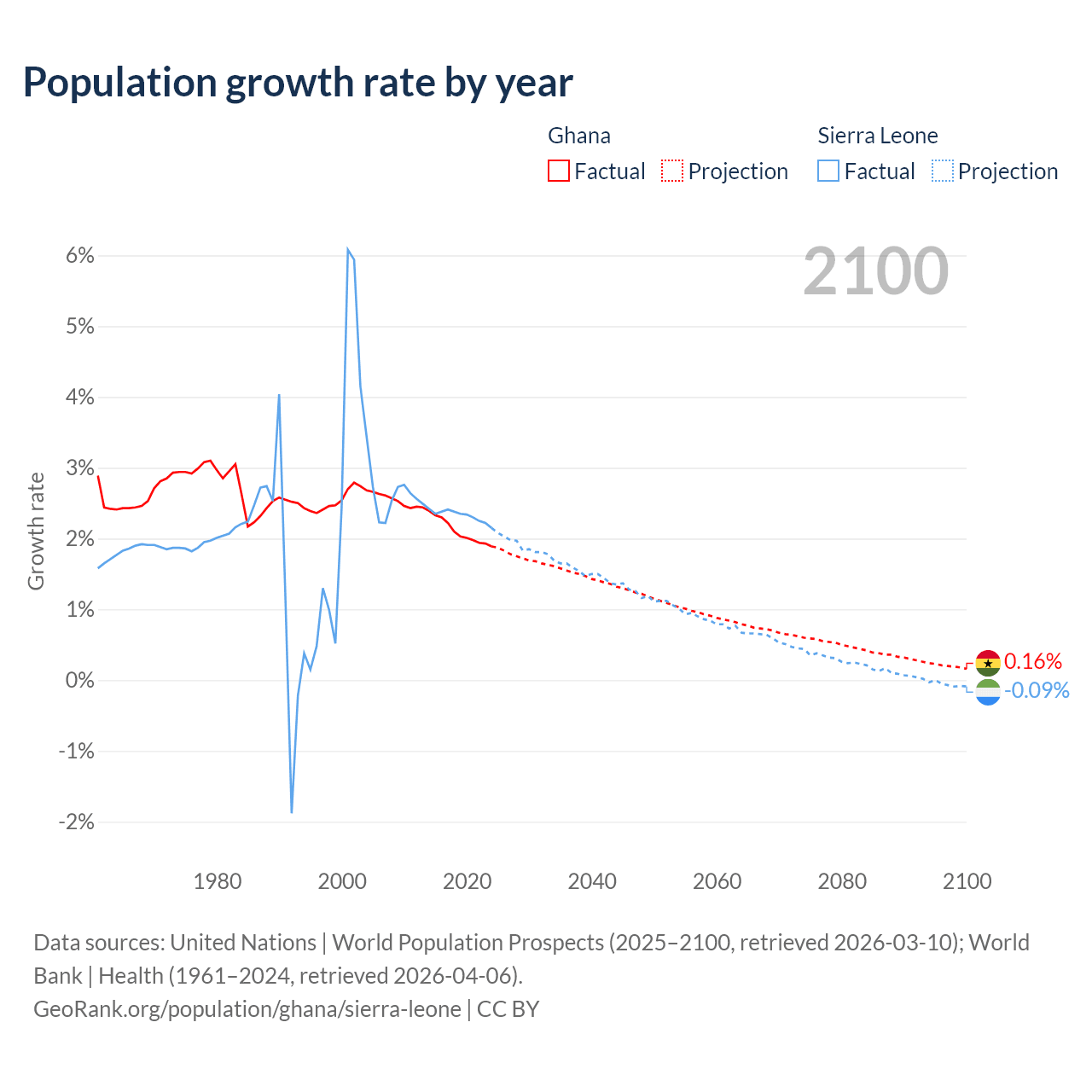 - For the last 10 years, Ghana has had an average growth rate of +2.1% per year vs +2.32% in Sierra Leone.