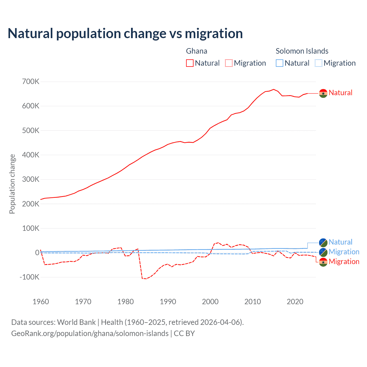 Over the last 10 years, 98.6% of the population change in Ghana is from natural causes (a gain of 6,484,449 people) and 1.37% is from migration (a loss of 90,310 people). In the Solomon Islands 82.8% is from natural causes (a gain of 168,727 people) and 17.2% is from migration (a gain of 35,031 people).