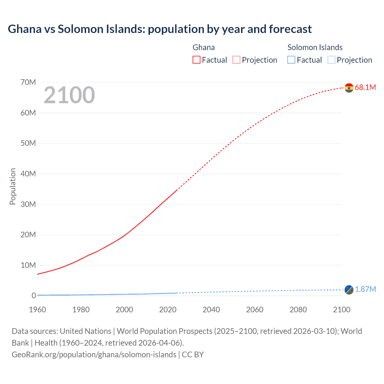 The latest officially reported population of Ghana was 34,427,414 in 2024 vs 819,198 people in the Solomon Islands in 2024. In 2026, based on the adjusted UN estimation, the current Ghana's population is 35,885,254 people compared to 863,951 in the Solomon Islands.