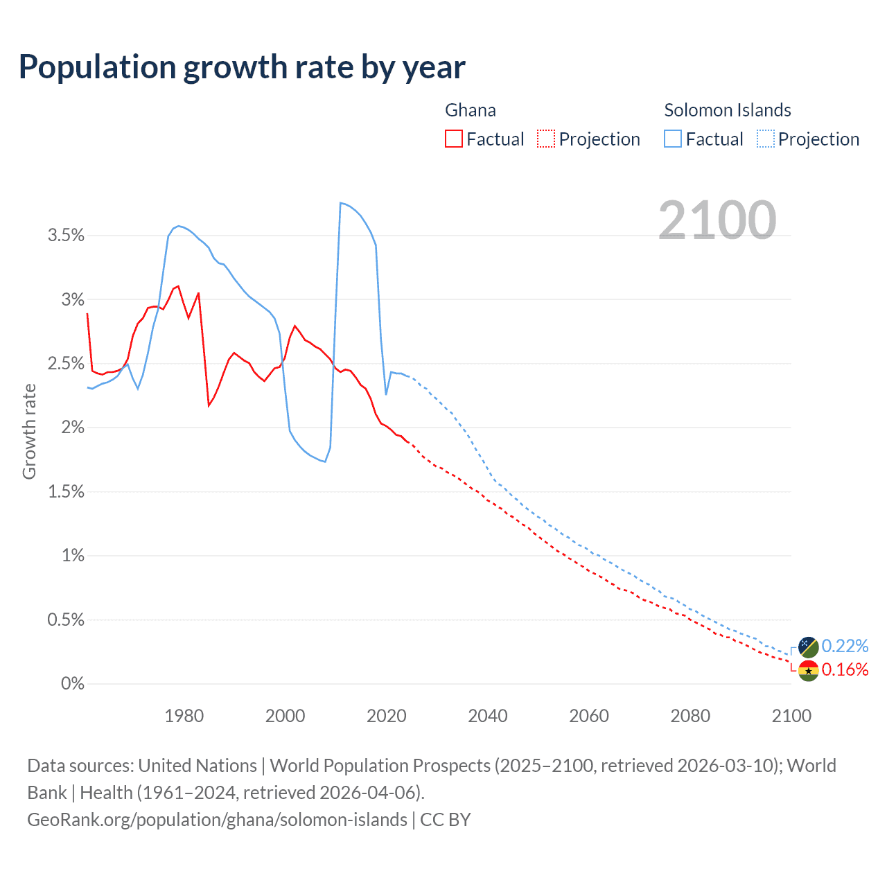 - For the last 10 years, Ghana has had an average growth rate of +2.1% per year vs +2.95% in the Solomon Islands.