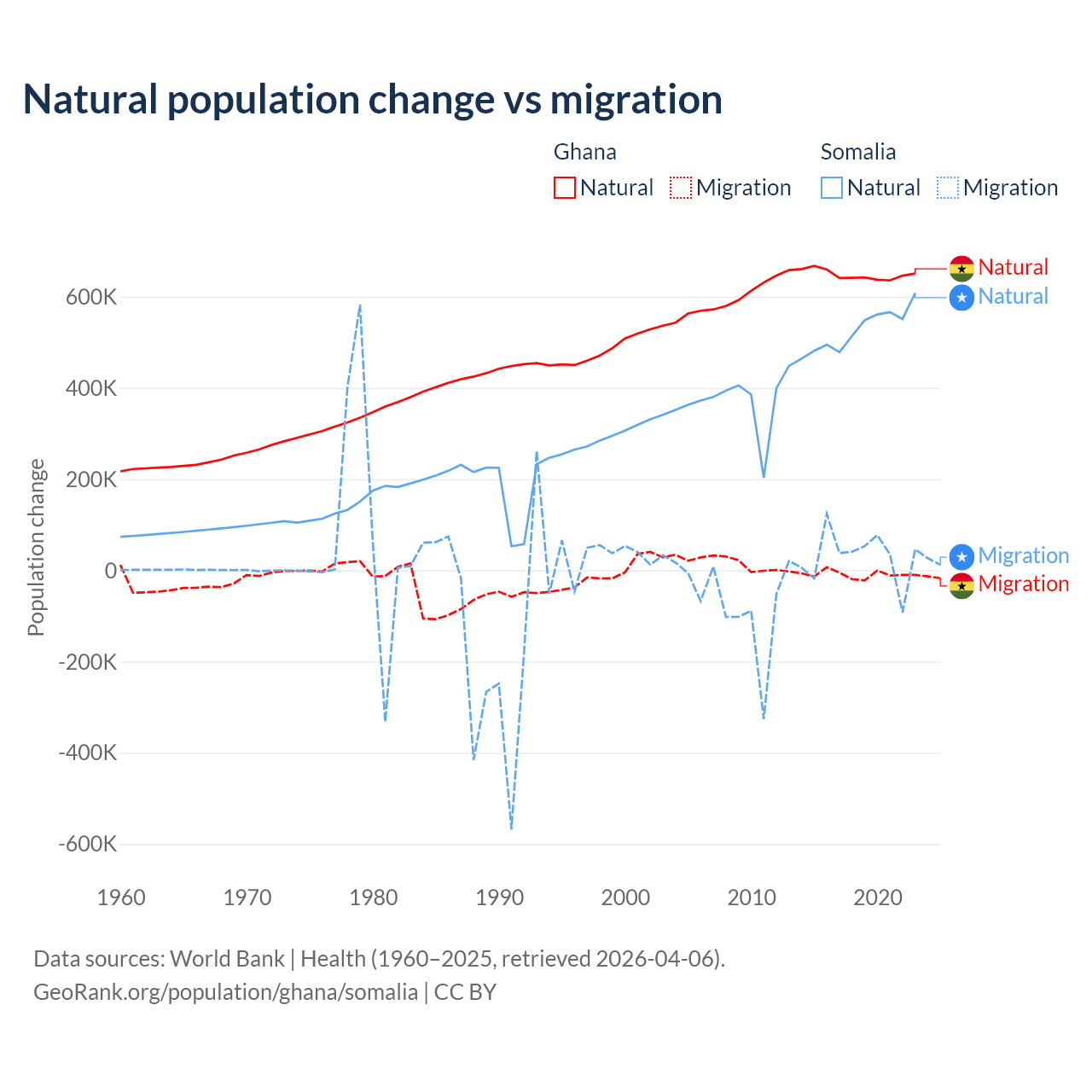 Over the last 10 years, 98.6% of the population change in Ghana is from natural causes (a gain of 6,484,449 people) and 1.37% is from migration (a loss of 90,310 people). In Somalia 94.4% is from natural causes (a gain of 5,270,105 people) and 5.58% is from migration (a gain of 311,487 people).