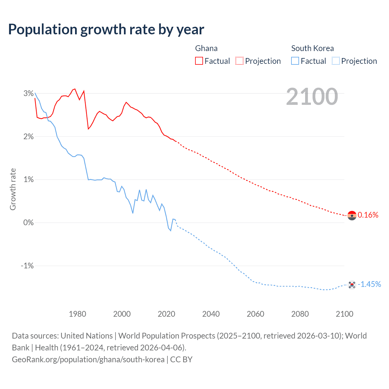 - For the last 10 years, Ghana has had an average growth rate of +2.1% per year vs +0.24% in South Korea.