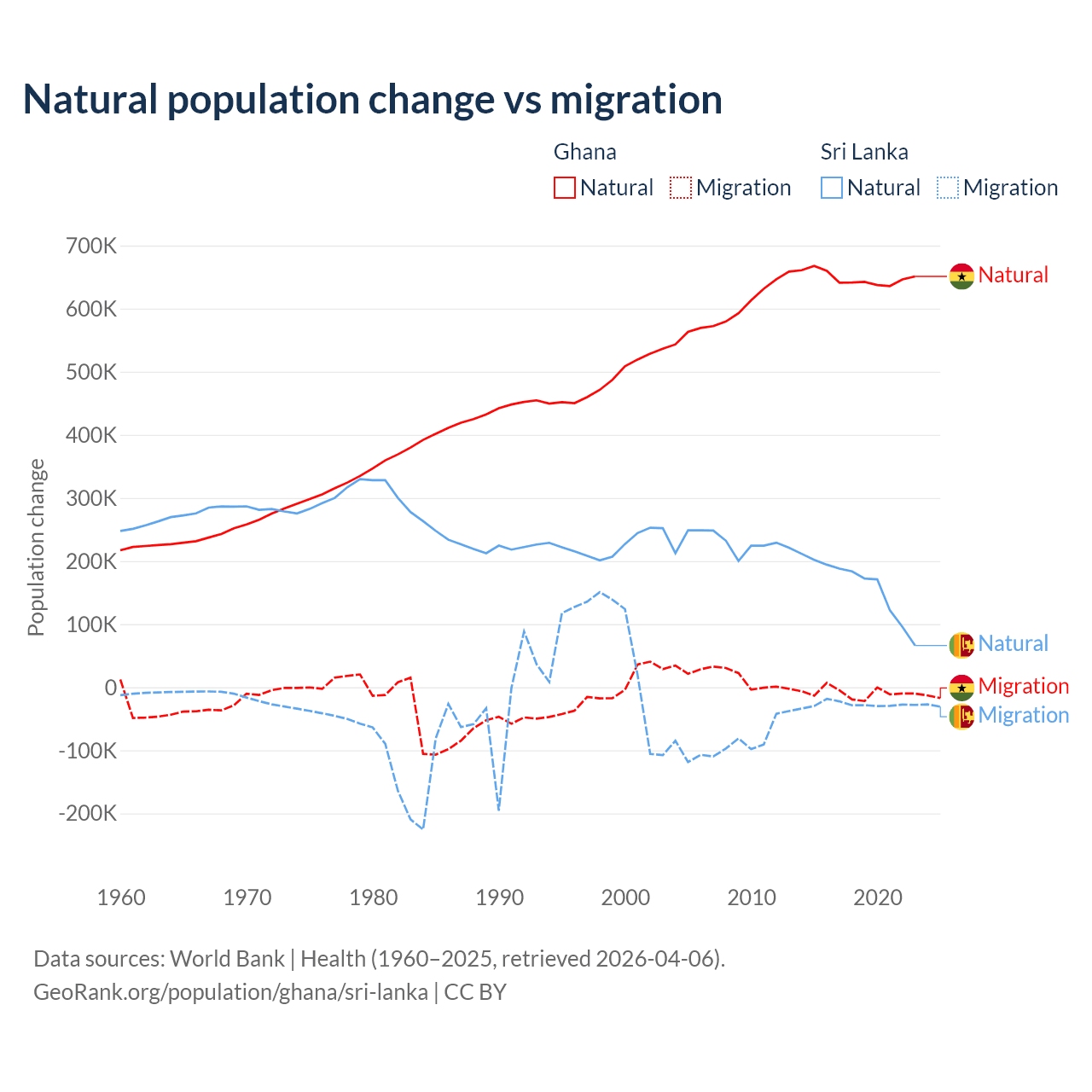 Over the last 10 years, 98.6% of the population change in Ghana is from natural causes (a gain of 6,484,449 people) and 1.37% is from migration (a loss of 90,310 people). In Sri Lanka 85.3% is from natural causes (a gain of 1,605,749 people) and 14.7% is from migration (a loss of 276,121 people).