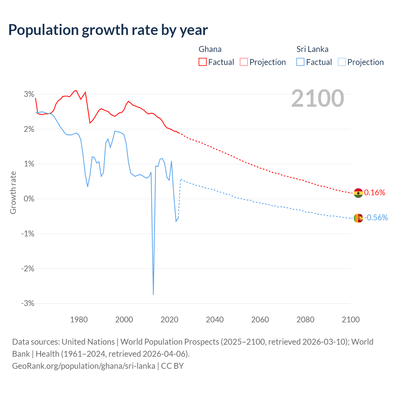 - For the last 10 years, Ghana has had an average growth rate of +2.1% per year vs +0.57% in Sri Lanka.