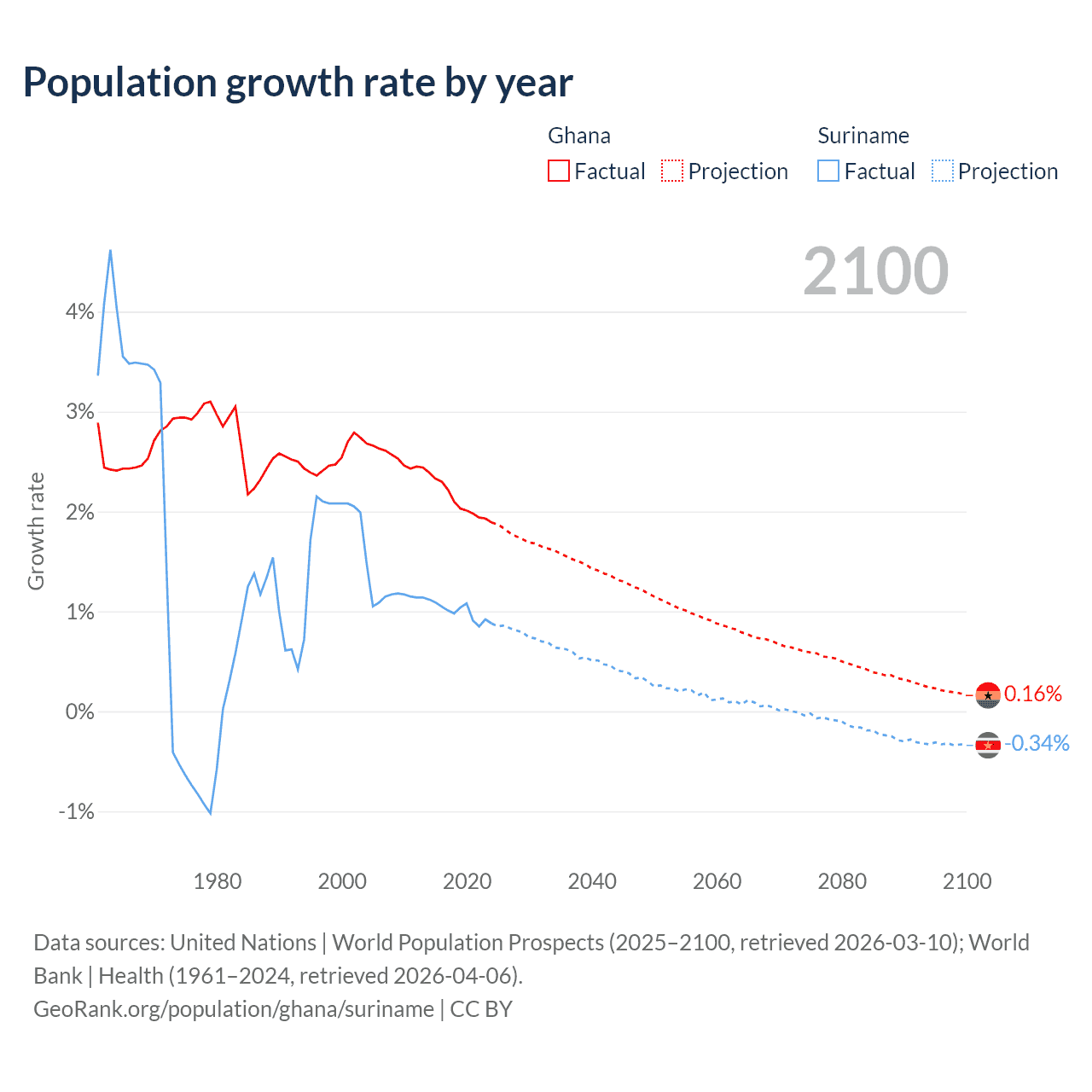 - For the last 10 years, Ghana has had an average growth rate of +2.1% per year vs +0.99% in Suriname.