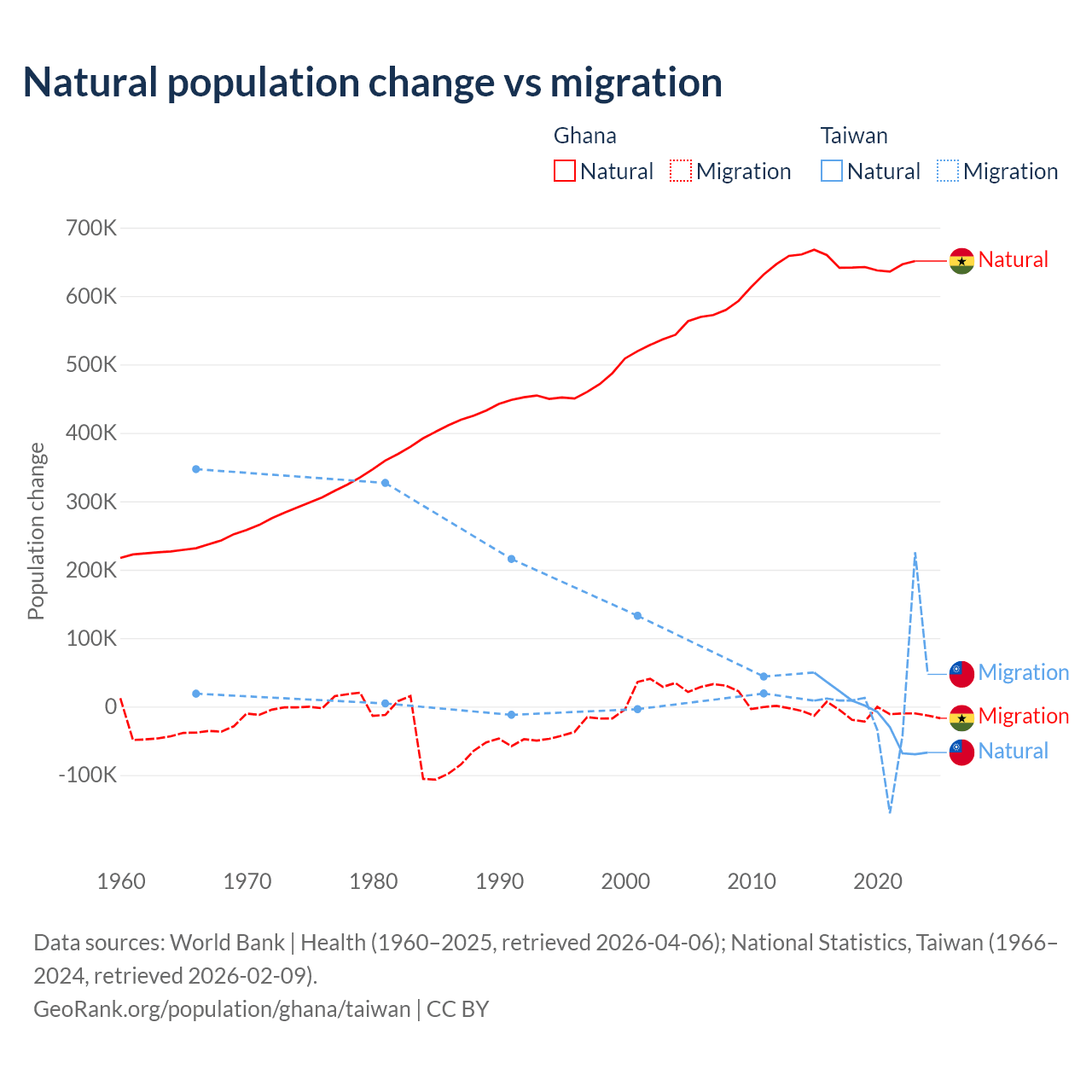 Over the last 10 years, 98.6% of the population change in Ghana is from natural causes (a gain of 6,484,449 people) and 1.37% is from migration (a loss of 90,310 people). In Taiwan 56.7% is from natural causes (a loss of 57,467 people) and 43.3% is from migration (a gain of 43,884 people).