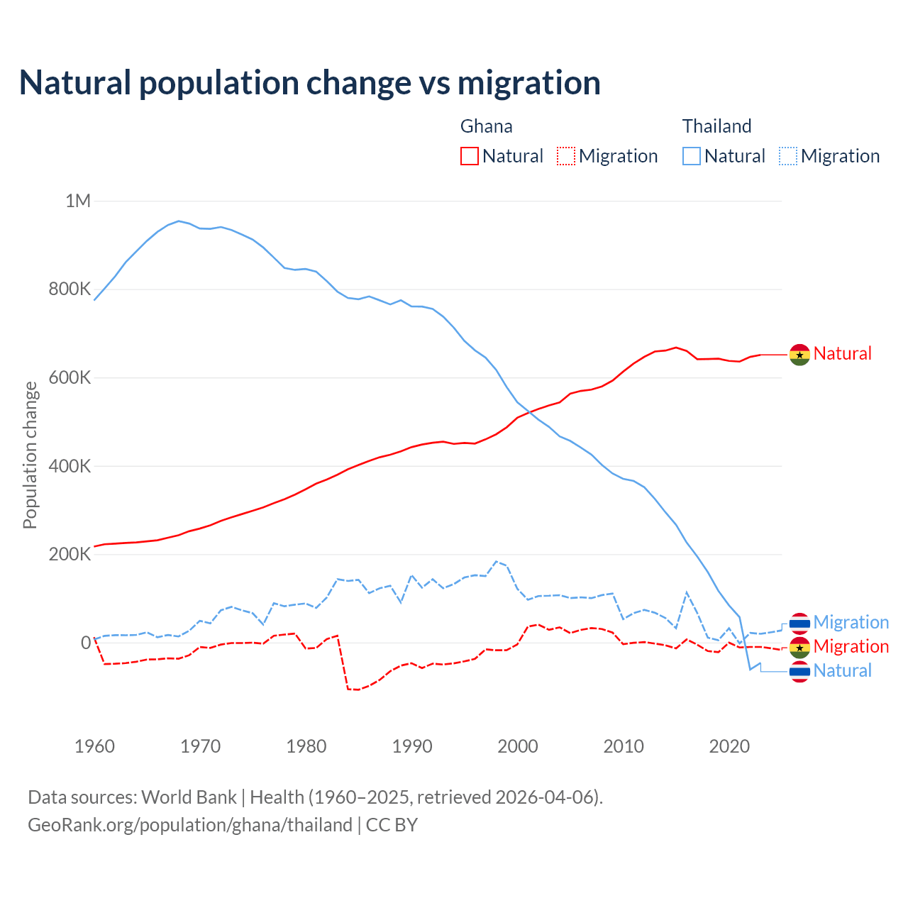 Over the last 10 years, 98.6% of the population change in Ghana is from natural causes (a gain of 6,484,449 people) and 1.37% is from migration (a loss of 90,310 people). In Thailand 78.4% is from natural causes (a gain of 1,292,528 people) and 21.6% is from migration (a gain of 355,361 people).