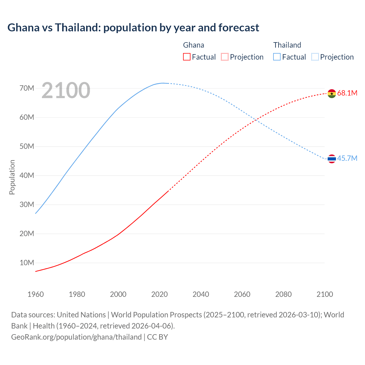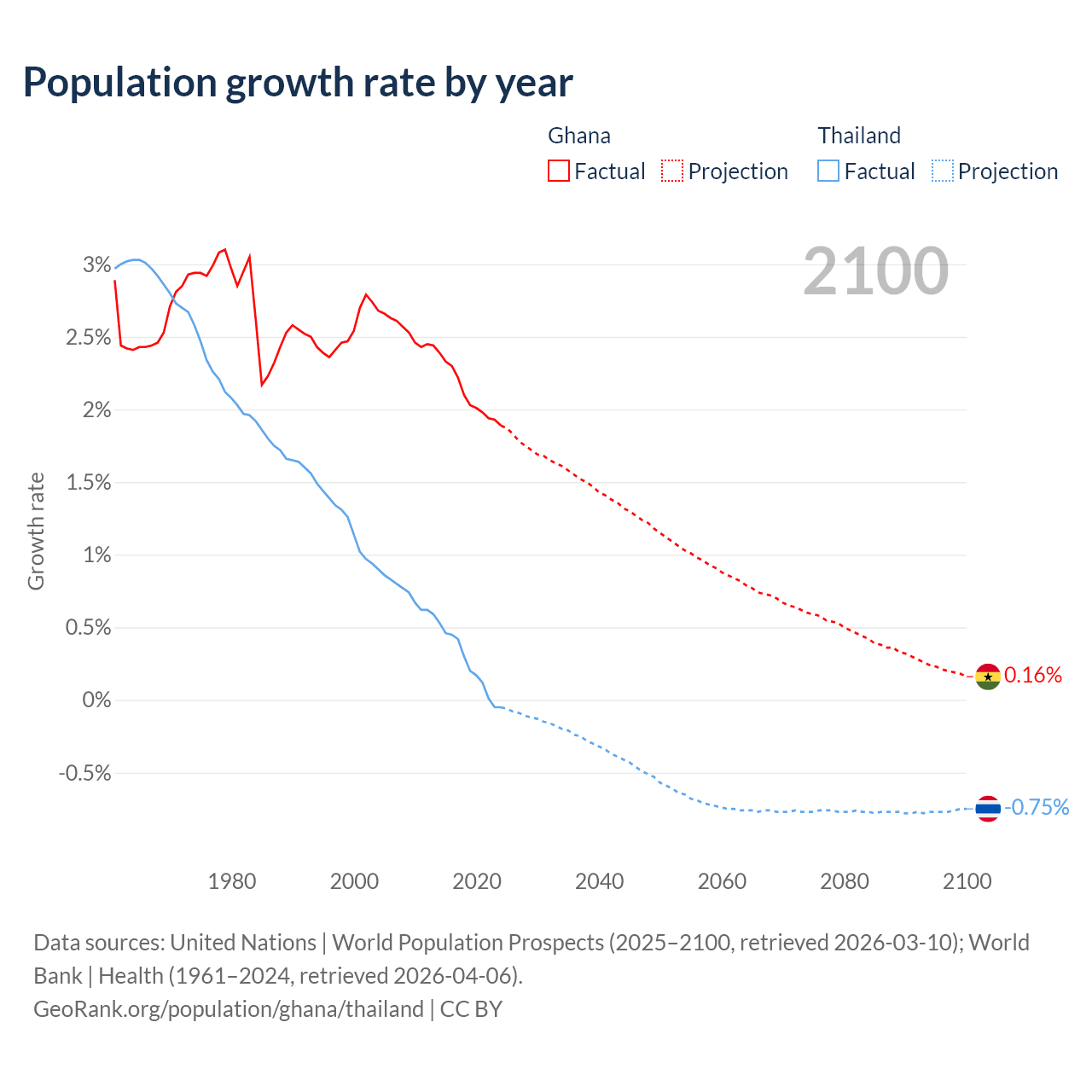 - For the last 10 years, Ghana has had an average growth rate of +2.1% per year vs +0.23% in Thailand.