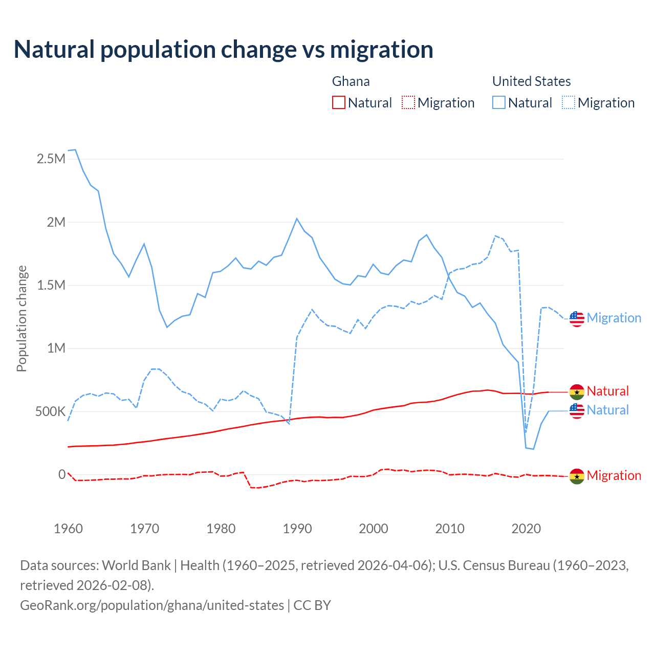 Over the last 10 years, 98.6% of the population change in Ghana is from natural causes (a gain of 6,484,449 people) and 1.37% is from migration (a loss of 90,310 people). In the United States 35.8% is from natural causes (a gain of 8,005,866 people) and 64.2% is from migration (a gain of 14,334,286 people).