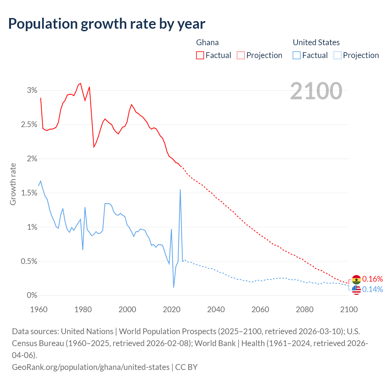 - For the last 10 years, Ghana has had an average growth rate of +2.1% per year vs +0.65% in the United States.