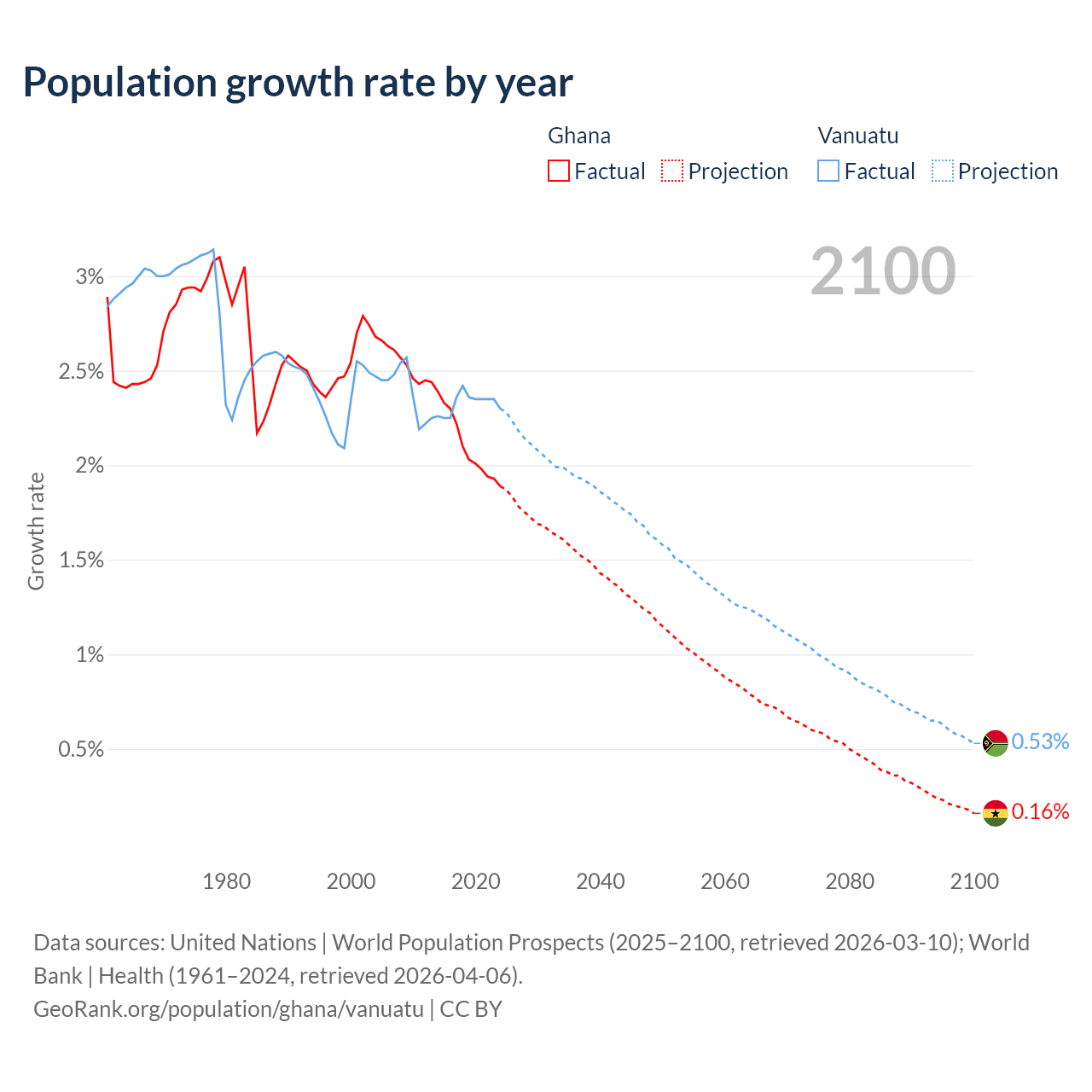 - For the last 10 years, Ghana has had an average growth rate of +2.1% per year vs +2.33% in Vanuatu.